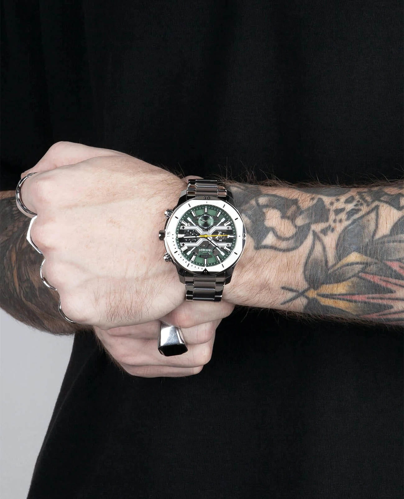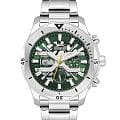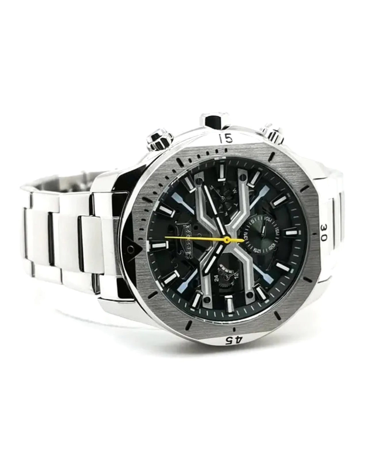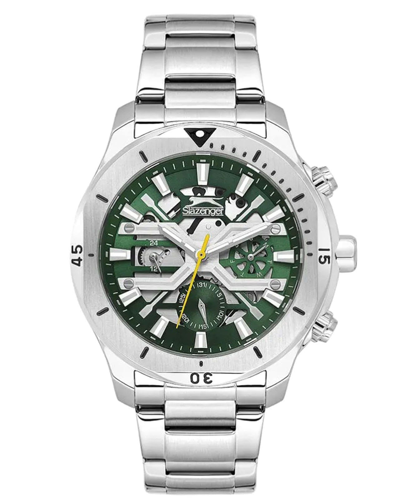 Мужские кварцевые часы Slazenger — это выразительный и функциональный аксессуар. Корпус диаметром 44 мм и толщиной 12 мм выполнен из нержавеющей стали 316L. Циферблат зелёного цвета частично скелетонизирован. Циферблат защищён минеральным стекломМинеральное стеклоМинеральное стекло представляет собой искусственно выращенный минерал кварца. Такое стекло отличается особой устойчивостью к повреждениям и царапинам. Уступает по некоторым качествам сапфировому стеклу.. Механизм — кварцевый калибр VX9JE1. Часы оснащены индикацией дня недели, даты и 12/24-часового формата времени. Завинчивающаяся задняя крышка обеспечивает дополнительную защиту. Часы оснащены стальным браслетом с раскладной застёжкойРаскладная застёжкаТакой тип застёжки используется только на браслетах из металла. Она никогда не раскрывается полностью, происходит разделение на 2 и более частей. Раскладывающая застёжка снизит вероятность потери часов к минимуму.. Водонепроницаемость 50 м позволяет использовать часы в повседневных условиях. Гарантия — 12 месяцев. Идеальный выбор для тех, кто ценит стиль, функциональность и качество.