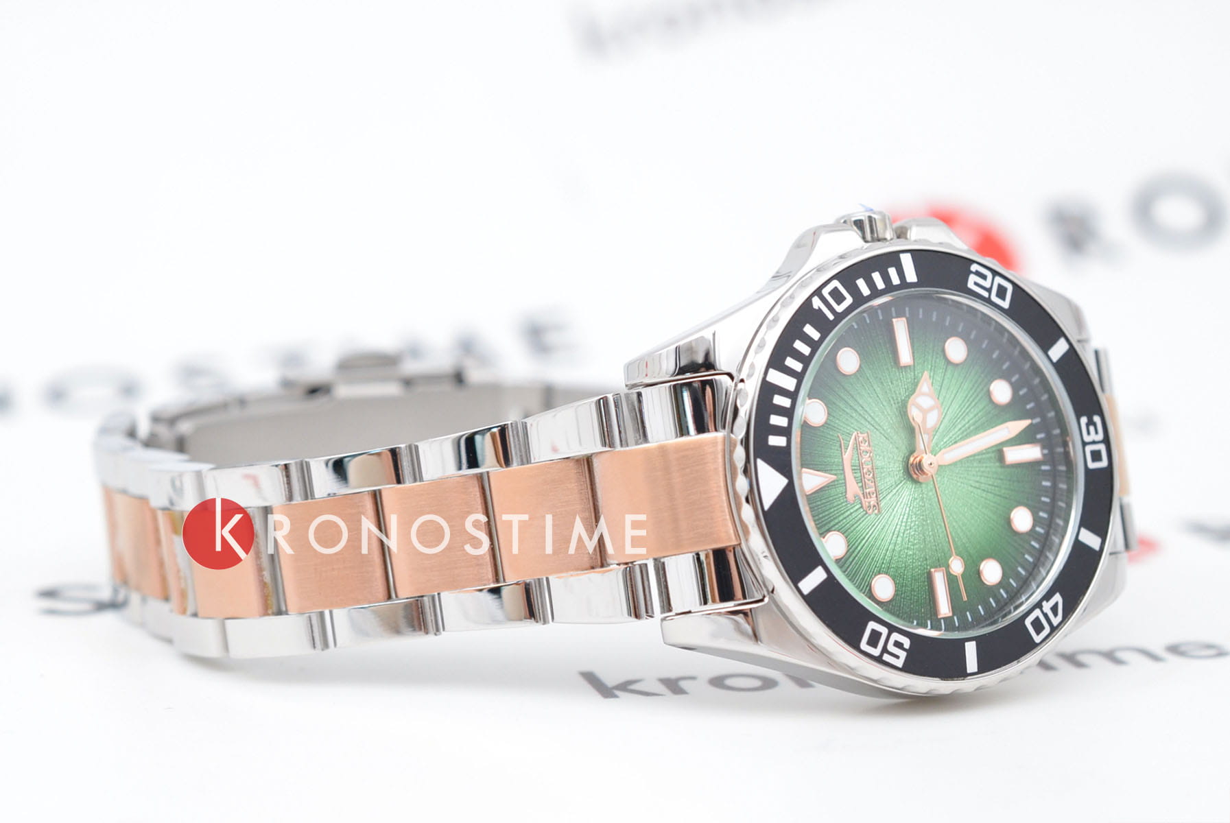 Женские кварцевые часы Slazenger — это элегантный аксессуар. Корпус диаметром 33 мм и толщиной 9 мм выполнен из суперметалла. Безель с IP-покрытиемIP-покрытиеМетод ионного напыления. Демонстрирует повышенную устойчивость к истиранию, окислению и химическим веществам. Под воздействием высокого давления и температуры около 1500°C молекулы металла надёжно соединяются с частицами корпуса часов.. Циферблат зелёного цвета оформлен индексами и стрелками. Циферблат защищён минеральным стекломМинеральное стеклоМинеральное стекло представляет собой искусственно выращенный минерал кварца. Такое стекло отличается особой устойчивостью к повреждениям и царапинам. Уступает по некоторым качествам сапфировому стеклу.. Механизм — кварцевый. Стрелки и метки с люминесцентным покрытиемЛюминесцентное покрытиеПозволяет считывать показания времени в темноте. Производители наносят на стрелки, часовые индексы, безель или поверхность циферблата светонакопительный состав, дающий холодное свечение., обеспечивающим хорошую читаемость в темноте. Часы оснащены браслетом из суперметалла с IP-покрытиемIP-покрытиеМетод ионного напыления. Демонстрирует повышенную устойчивость к истиранию, окислению и химическим веществам. Под воздействием высокого давления и температуры около 1500°C молекулы металла надёжно соединяются с частицами корпуса часов. и раскладной застёжкойРаскладная застёжкаТакой тип застёжки используется только на браслетах из металла. Она никогда не раскрывается полностью, происходит разделение на 2 и более частей. Раскладывающая застёжка снизит вероятность потери часов к минимуму.. Водонепроницаемость 50 м позволяет использовать часы в повседневных условиях. Гарантия — 12 месяцев. Идеальный выбор для тех, кто ценит стиль и качество.