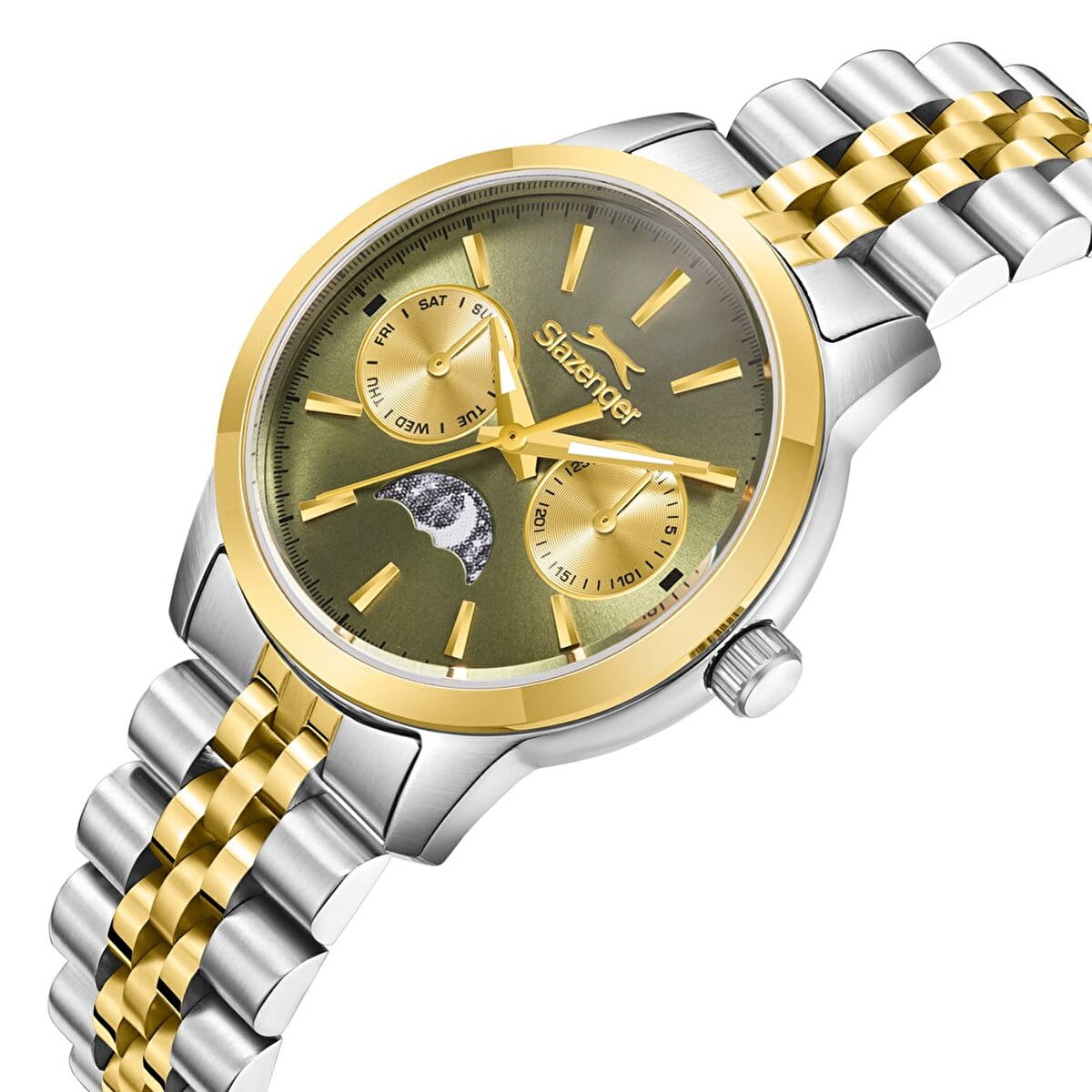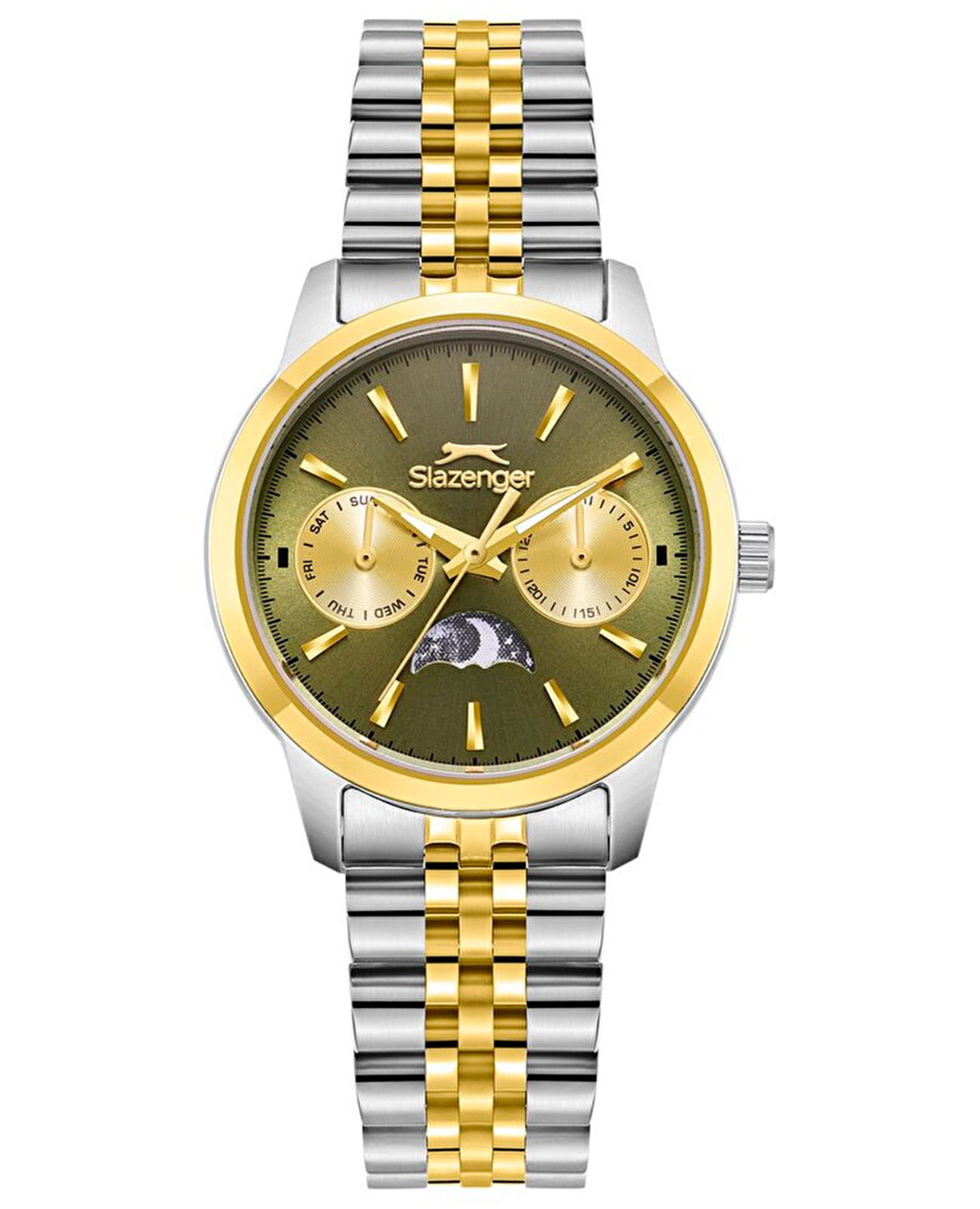 Женские кварцевые часы Slazenger — это выразительный и функциональный аксессуар. Корпус диаметром 33 мм и толщиной 10 мм выполнен из суперметалла. БезельБезельВнешний ободок, закрепляющий стекло. В спортивных часах так называется поворотное кольцо с делениями на циферблате, выполняет роль таймера – замеряет отрезки времени на шкале. Неподвижный безель – элемент декора. Однонаправленно вращающийся безель на дайверских часах позволяет фиксировать моменты погружения и выныривания на поверхность. из суперметалла с IP-покрытиемIP-покрытиеМетод ионного напыления. Демонстрирует повышенную устойчивость к истиранию, окислению и химическим веществам. Под воздействием высокого давления и температуры около 1500°C молекулы металла надёжно соединяются с частицами корпуса часов.. Циферблат зелёного цвета оформлен индексами и стрелками. Циферблат защищён минеральным стекломМинеральное стеклоМинеральное стекло представляет собой искусственно выращенный минерал кварца. Такое стекло отличается особой устойчивостью к повреждениям и царапинам. Уступает по некоторым качествам сапфировому стеклу.. Механизм — кварцевый калибр VX3HE11. Часы оснащены индикацией дня недели, даты и индикатором день/ночь, отображающим солнце или луну в зависимости от времени суток. Часы оснащены браслетом из суперметалла с IP-покрытиемIP-покрытиеМетод ионного напыления. Демонстрирует повышенную устойчивость к истиранию, окислению и химическим веществам. Под воздействием высокого давления и температуры около 1500°C молекулы металла надёжно соединяются с частицами корпуса часов. на на застёжке «бабочка» с кнопкамиЗастёжка "бабочка"Такой вид застёжки дополняется предохранителями, помогающими избежать случайного раскрытия браслета. Обладают изящным исполнением. . Водонепроницаемость 50 м позволяет использовать часы в повседневных условиях. Гарантия — 12 месяцев. Идеальный выбор для тех, кто ценит стиль, функциональность и качество.
