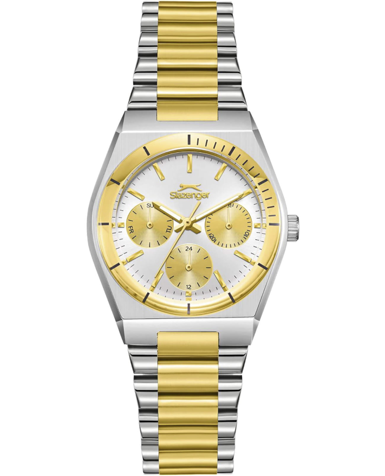 Женские кварцевые часы Slazenger — это элегантный и функциональный аксессуар. Корпус диаметром 33 мм и толщиной 10,5 мм выполнен из суперметалла. БезельБезельВнешний ободок, закрепляющий стекло. В спортивных часах так называется поворотное кольцо с делениями на циферблате, выполняет роль таймера – замеряет отрезки времени на шкале. Неподвижный безель – элемент декора. Однонаправленно вращающийся безель на дайверских часах позволяет фиксировать моменты погружения и выныривания на поверхность. с IP-покрытиемIP-покрытиеМетод ионного напыления. Демонстрирует повышенную устойчивость к истиранию, окислению и химическим веществам. Под воздействием высокого давления и температуры около 1500°C молекулы металла надёжно соединяются с частицами корпуса часов.. Циферблат серебристого цвета оформлен индексами и стрелками. Циферблат защищён минеральным стекломМинеральное стеклоМинеральное стекло представляет собой искусственно выращенный минерал кварца. Такое стекло отличается особой устойчивостью к повреждениям и царапинам. Уступает по некоторым качествам сапфировому стеклу.. Механизм — кварцевый. Часы оснащены индикацией дня недели, даты и 12/24-часового формата времени. Стрелки с люминесцентным покрытиемЛюминесцентное покрытиеПозволяет считывать показания времени в темноте. Производители наносят на стрелки, часовые индексы, безель или поверхность циферблата светонакопительный состав, дающий холодное свечение., обеспечивающим хорошую читаемость в темноте. Часы оснащены браслетом из суперметалла с IP-покрытиемIP-покрытиеМетод ионного напыления. Демонстрирует повышенную устойчивость к истиранию, окислению и химическим веществам. Под воздействием высокого давления и температуры около 1500°C молекулы металла надёжно соединяются с частицами корпуса часов. и раскладной застёжкойРаскладная застёжкаТакой тип застёжки используется только на браслетах из металла. Она никогда не раскрывается полностью, происходит разделение на 2 и более частей. Раскладывающая застёжка снизит вероятность потери часов к минимуму.. Водонепроницаемость 50 м позволяет использовать часы в повседневных условиях. Гарантия — 12 месяцев. Идеальный выбор для тех, кто ценит стиль, функциональность и качество.