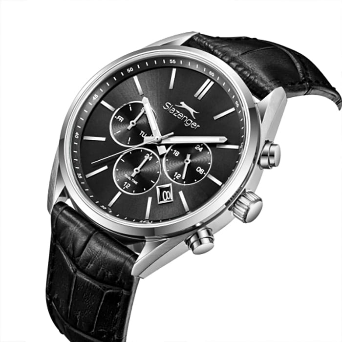 Мужские кварцевые часы Slazenger — это выразительный и функциональный аксессуар. Корпус диаметром 42 мм и толщиной 12 мм выполнен из нержавеющей стали 316L. Циферблат чёрного цвета оформлен индексами и стрелками. Циферблат защищён минеральным стекломМинеральное стеклоМинеральное стекло представляет собой искусственно выращенный минерал кварца. Такое стекло отличается особой устойчивостью к повреждениям и царапинам. Уступает по некоторым качествам сапфировому стеклу.. Механизм — кварцевый. Часы оснащены индикацией дня недели, даты, 12/24-часового формата времени и функцией второго часового пояса (GMT)Второй часовой поясФункция, позволяющая отображать время двух часовых поясов одновременно.. Окошко даты расположено между 4 и 5 часами. Стрелки и метки с люминесцентным покрытиемЛюминесцентное покрытиеПозволяет считывать показания времени в темноте. Производители наносят на стрелки, часовые индексы, безель или поверхность циферблата светонакопительный состав, дающий холодное свечение., обеспечивающим хорошую читаемость в темноте. Часы оснащены кожаным ремешком с стандартной застёжкой. Водонепроницаемость 100 м позволяет использовать часы для плавания и повседневного ношения. Гарантия — 12 месяцев. Идеальный выбор для тех, кто ценит стиль, функциональность и качество.