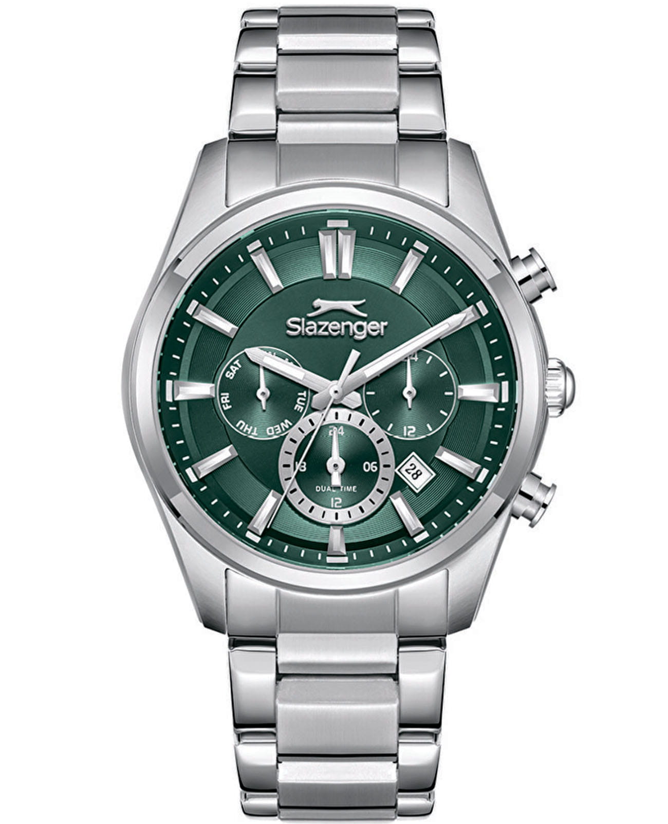 Мужские кварцевые часы Slazenger — это выразительный и функциональный аксессуар. Корпус диаметром 43 мм и толщиной 12 мм выполнен из нержавеющей стали 316L. Циферблат зелёного цвета оформлен индексами и стрелками с люминесцентным покрытиемЛюминесцентное покрытиеПозволяет считывать показания времени в темноте. Производители наносят на стрелки, часовые индексы, безель или поверхность циферблата светонакопительный состав, дающий холодное свечение., обеспечивающим хорошую читаемость в темноте. Циферблат защищён минеральным стекломМинеральное стеклоМинеральное стекло представляет собой искусственно выращенный минерал кварца. Такое стекло отличается особой устойчивостью к повреждениям и царапинам. Уступает по некоторым качествам сапфировому стеклу.. Механизм — кварцевый калибр JP25. Часы оснащены индикацией дня недели, даты, 12/24-часового формата времени и функцией второго часового пояса (GMT)Второй часовой поясФункция, позволяющая отображать время двух часовых поясов одновременно.. Окошко даты расположено между 4 и 5 часами. Часы оснащены стальным браслетом из нержавеющей стали 316L с раскладной застёжкойРаскладная застёжкаТакой тип застёжки используется только на браслетах из металла. Она никогда не раскрывается полностью, происходит разделение на 2 и более частей. Раскладывающая застёжка снизит вероятность потери часов к минимуму.. Водонепроницаемость 100 м позволяет использовать часы для плавания и повседневного ношения. Гарантия — 12 месяцев. Идеальный выбор для тех, кто ценит стиль, функциональность и качество.