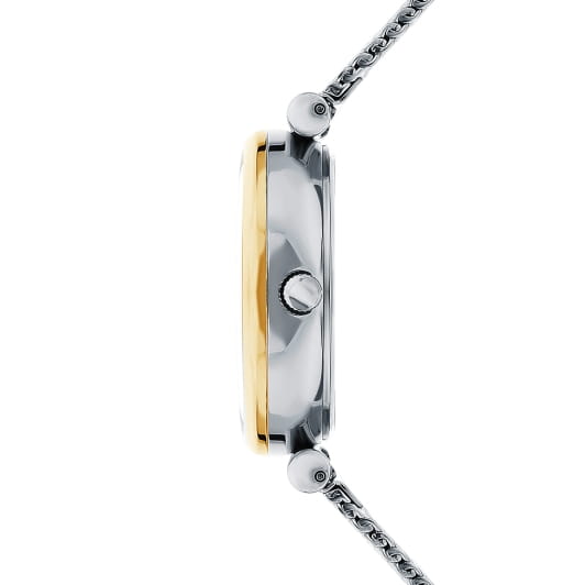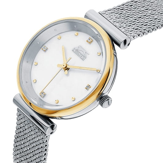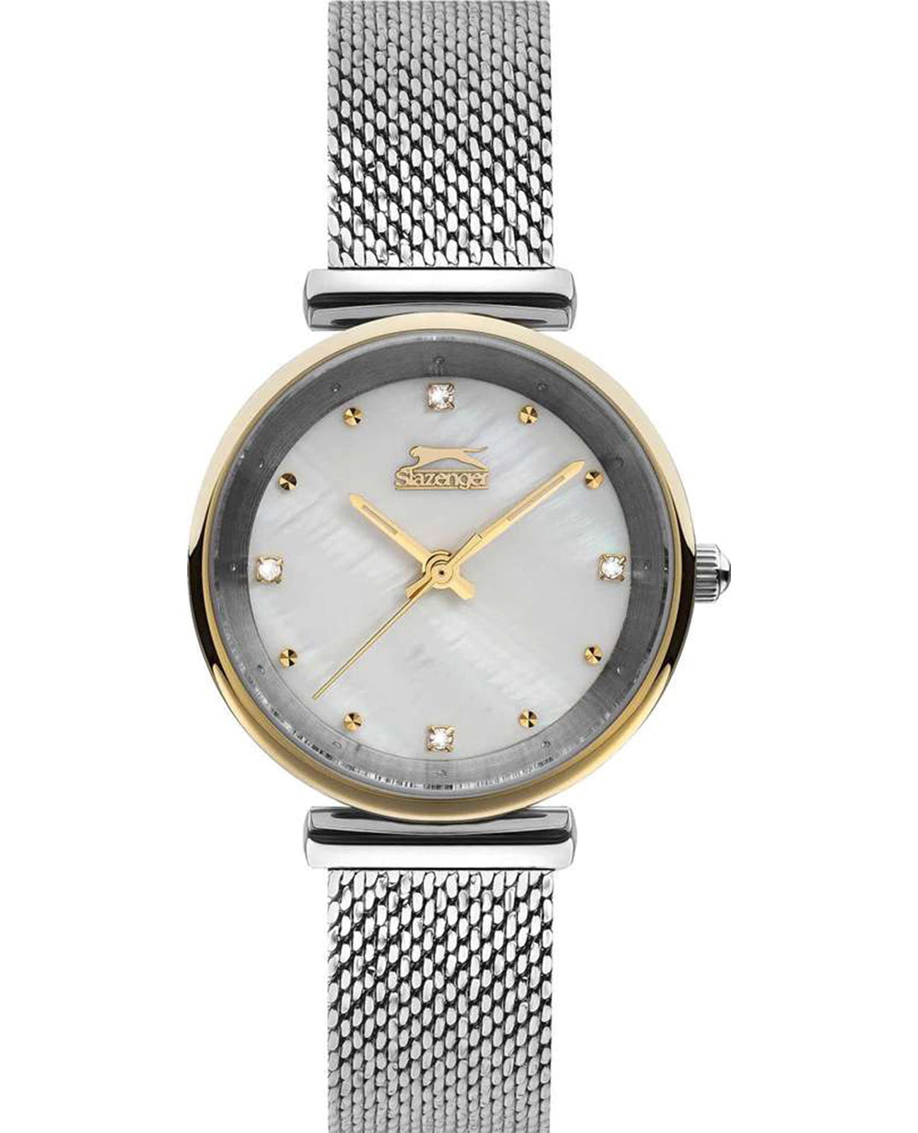 Женские кварцевые часы Slazenger — это элегантный аксессуар. Корпус диаметром 30 мм и толщиной 8 мм выполнен из суперметалла. БезельБезельВнешний ободок, закрепляющий стекло. В спортивных часах так называется поворотное кольцо с делениями на циферблате, выполняет роль таймера – замеряет отрезки времени на шкале. Неподвижный безель – элемент декора. Однонаправленно вращающийся безель на дайверских часах позволяет фиксировать моменты погружения и выныривания на поверхность. с IP-покрытиемIP-покрытиеМетод ионного напыления. Демонстрирует повышенную устойчивость к истиранию, окислению и химическим веществам. Под воздействием высокого давления и температуры около 1500°C молекулы металла надёжно соединяются с частицами корпуса часов.. Циферблат серебристого цвета оформлен индексами, стрелками и украшен фианитами. Циферблат защищён минеральным стекломМинеральное стеклоМинеральное стекло представляет собой искусственно выращенный минерал кварца. Такое стекло отличается особой устойчивостью к повреждениям и царапинам. Уступает по некоторым качествам сапфировому стеклу.. Часы оснащены браслетом миланского плетения из суперметалла на раскладном замкеРаскладная застёжкаТакой тип застёжки используется только на браслетах из металла. Она никогда не раскрывается полностью, происходит разделение на 2 и более частей. Раскладывающая застёжка снизит вероятность потери часов к минимуму.. Водонепроницаемость 30 м позволяет использовать часы в повседневных условиях. Идеальный выбор для тех, кто ценит стиль и качество.