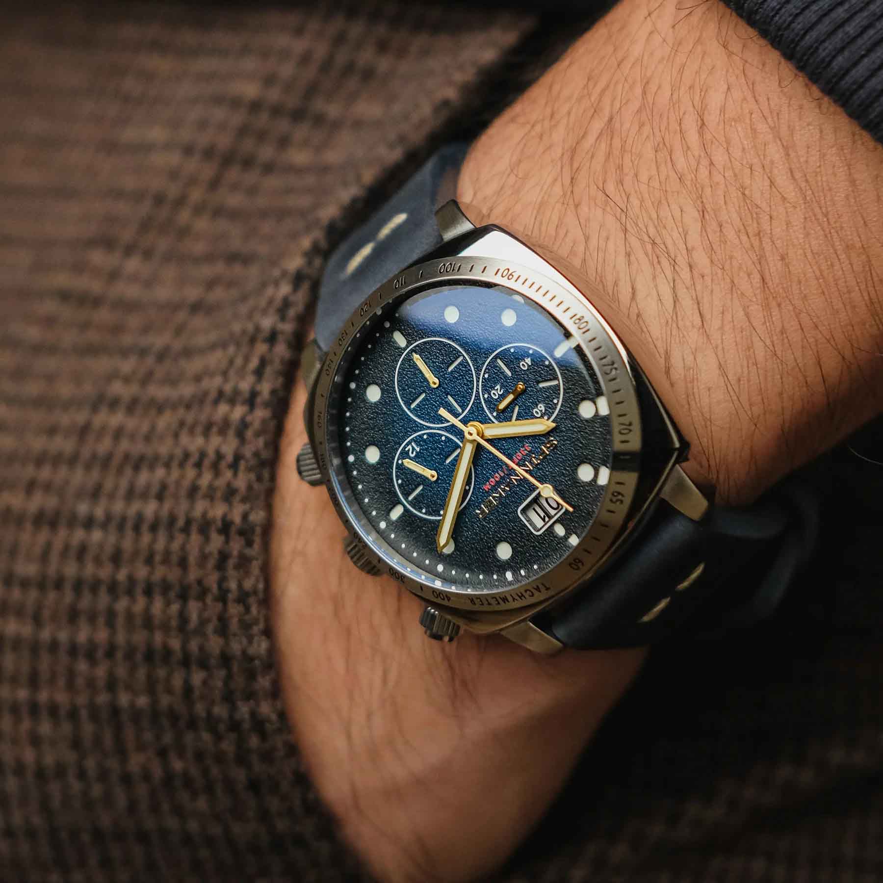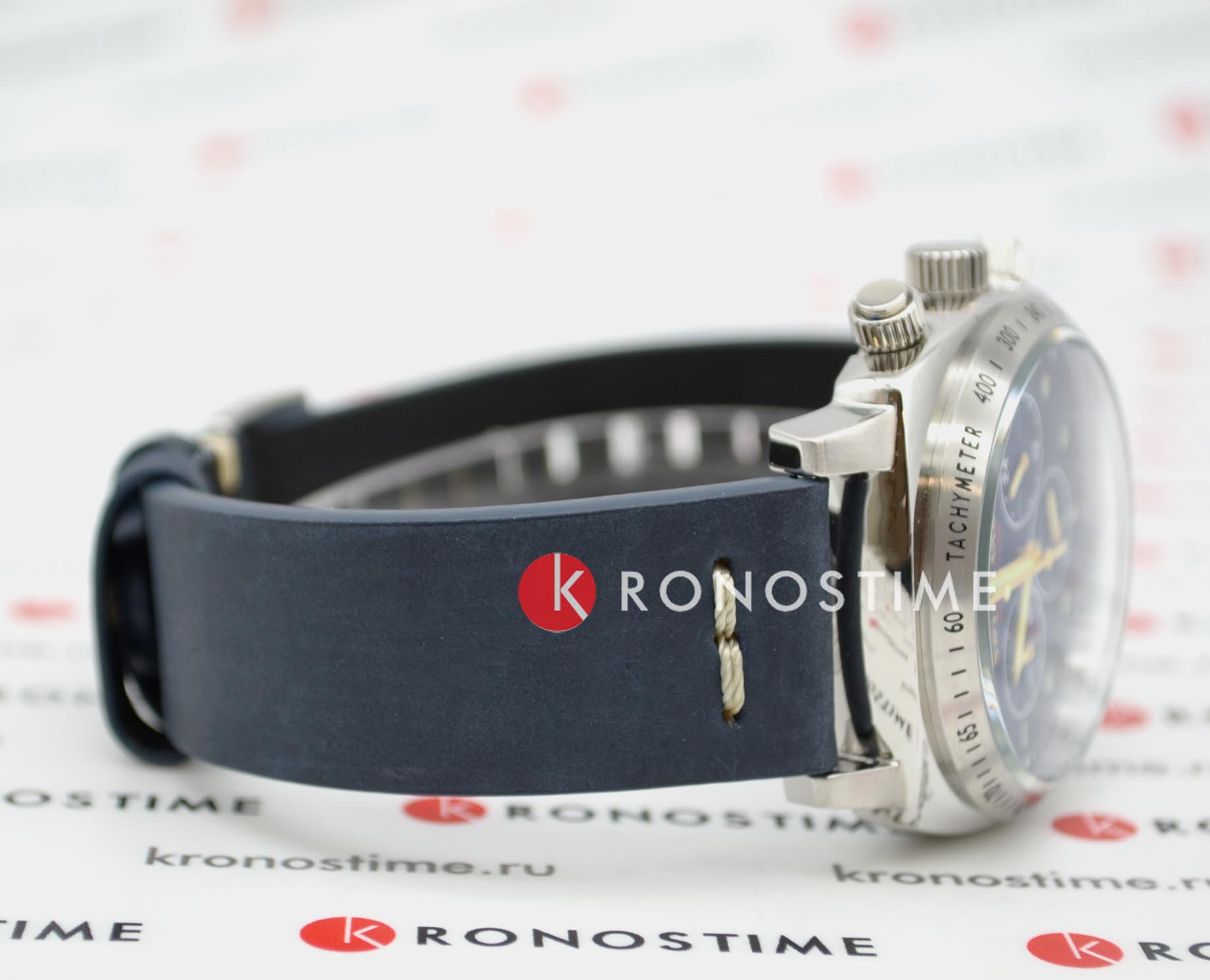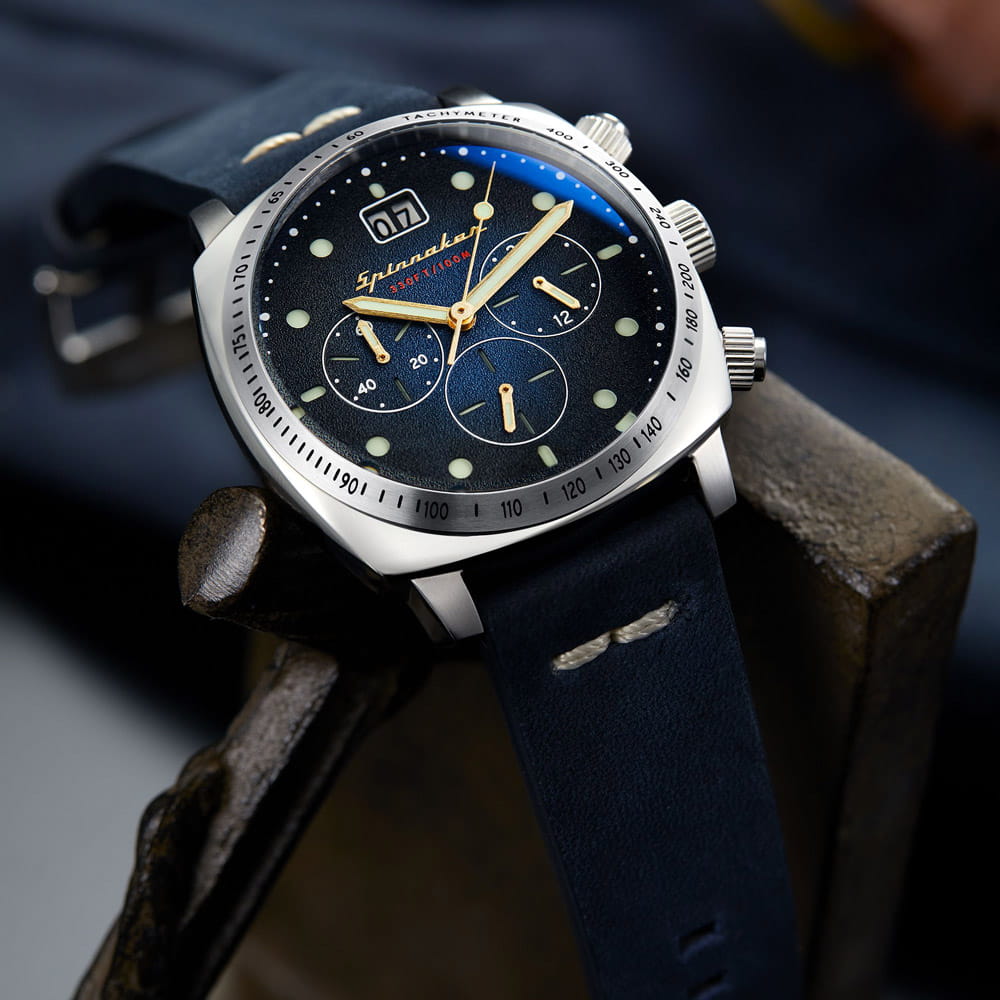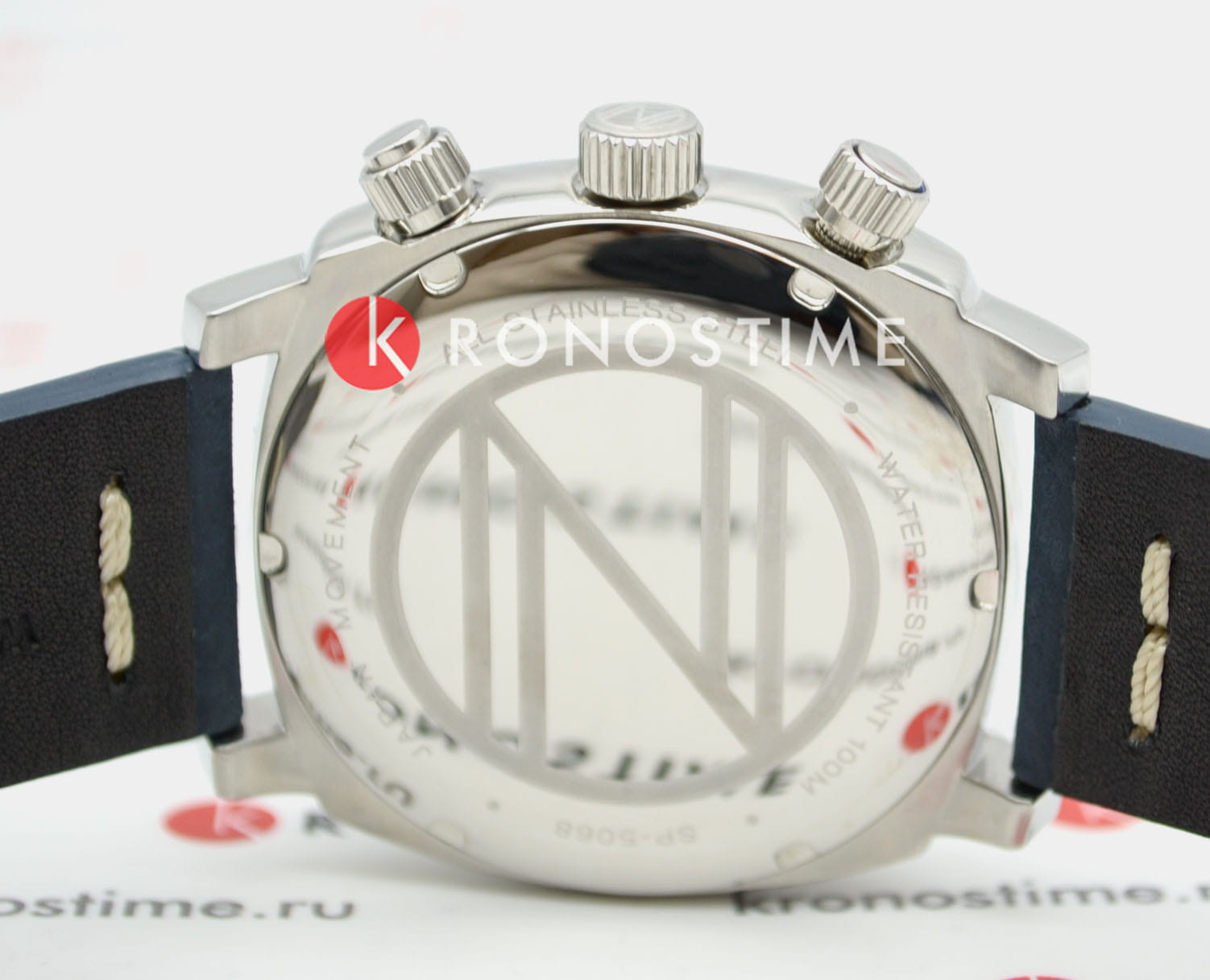Мужской кварцевый хронографХронографФункция позволяет измерять отрезки времени с особой точностью: часы, минуты, секунды. Верным признаком хронографа является наличие на циферблате 3 дополнительных окошек-счётчиков. с секундомеромСекундомерСекундоме́р — прибор, способный измерять интервалы времени с точностью до долей секунды. и тахиметромТахиметрРазмеченная шкала, располагается на ободке или безеле часов. Тахиметр позволяет рассчитать скорость на определённом участке пути, расстояние измеряется в километрах или милях. Spinnaker Hull SP-5068-03. Калибр механизма TMI VK73. Центральные часовая и минутная стрелки, секундная стрелка вынесена на малый циферблат. Большая дата в позиции 12 часов. 12/24х часовой формат времени. Корпус выполнен из нержавеющей стали. Кожаный ремешок шириной 22 мм, стандартная застежка. Циферблат с люминесцентным покрытиемЛюминесцентное покрытиеПозволяет считывать показания времени в темноте. Производители наносят на стрелки, часовые индексы, безель или поверхность циферблата светонакопительный состав, дающий холодное свечение. стрелок и меток, дополнен выпуклым минеральным стекломМинеральное стеклоМинеральное стекло представляет собой искусственно выращенный минерал кварца. Такое стекло отличается особой устойчивостью к повреждениям и царапинам. Уступает по некоторым качествам сапфировому стеклу. , устойчивым к мелким механическим повреждениям. Водостойкость WR 100 (плавание без погружения).