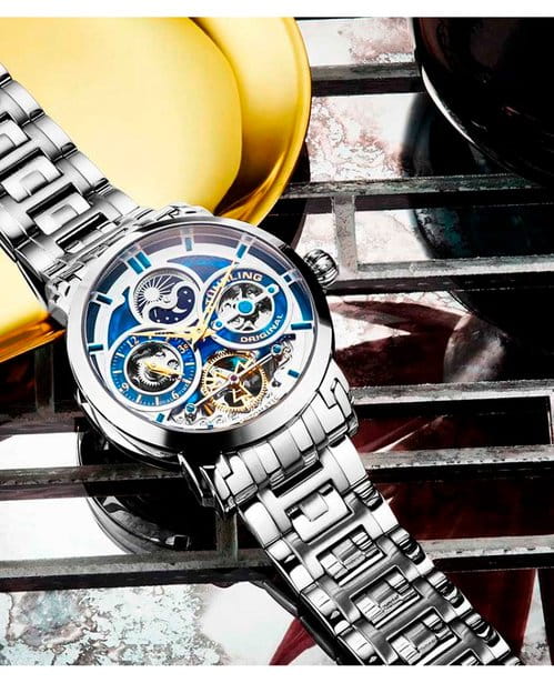 Мужские наручные часы Stührling Original 371B.02 из коллекции Luciano Automatic Skeleton сочетают в себе классический дизайн и современные технологии . Модель оснащена механическим механизмом с автоподзаводом, что гарантирует точность хода без необходимости ручного завода . Корпус часов диаметром 47 мм изготовлен из нержавеющей стали с комбинацией полированной и матовой отделки, что подчеркивает элегантность модели . Защиту циферблата обеспечивает прочное стекло KrysternaKrysternaKrysterna — инновационное стекло для наручных часов. Благодаря уникальной структуре, Krysterna объединяет ключевые преимущества двух материалов: твердость сапфира, защищающую от царапин, и гибкость минерального стекла, обеспечивающую устойчивость к деформациям. Такая комбинация делает его идеальным решением для часов, подверженных экстремальным нагрузкам, сохраняя при этом оптическую прозрачность., известное своей устойчивостью к царапинам и механическим повреждениям . Циферблат выполнен в стиле , что позволяет наблюдать за работой внутреннего механизма и демонстрирует сложность инженерного решения . Такой дизайн делает модель не только функциональной, но и стильной, привлекая внимание ценителей сложных технических решений. Браслет из того же материала на раскладной застёжкеРаскладная застёжкаТакой тип застёжки используется только на браслетах из металла. Она никогда не раскрывается полностью, происходит разделение на 2 и более частей. Раскладывающая застёжка снизит вероятность потери часов к минимуму.. Водонепроницаемость модели достигает 5 атмосфер (50 метров), что позволяет использовать их в повседневных условиях, включая контакт с водой, например, при мытье рук или дожде . Заводная головка с системой завинчивания обеспечивает дополнительную защиту механизма от внешних воздействий.
