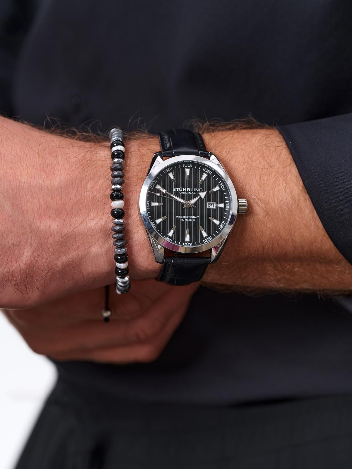 Stuhrling 3953L.1 — элегантные мужские часы, объединяющие строгую классику и современную функциональность. Корпус из нержавеющей стали создают ощущение монолитной надёжности, а глубокий циферблат с вертикальной текстурой придаёт модели выразительность и характер. Кожаный ремешок на стандартной застежке обеспечивает комфорт. Крупные метки и стрелки с люминесцентным покрытиемЛюминесцентное покрытиеПозволяет считывать показания времени в темноте. Производители наносят на стрелки, часовые индексы, безель или поверхность циферблата светонакопительный состав, дающий холодное свечение. обеспечивают идеальную читаемость даже в темноте. На позиции «3 часов» расположено аккуратное окно даты, подчёркивающее симметрию дизайна. Прочное стекло Krysterna защищает циферблат от царапин, а надёжный кварцевый механизм гарантирует стабильную точность. Stuhrling — выбор уверенного мужчины, ценящего сочетание функциональности, лаконичного дизайна и безупречной отделки.