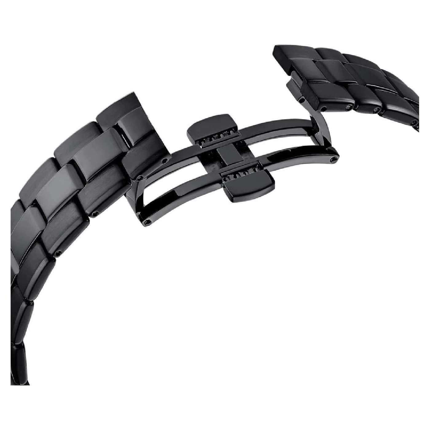 Часы Swarovski 5610472 воплощают в себе гармоничное сочетание современного дизайна и функциональности, идеально подходящее для тех, кто ценит стильные аксессуары. Эти швейцарские кварцевые часы с хронографомХронографФункция позволяет измерять отрезки времени с особой точностью: часы, минуты, секунды. Верным признаком хронографа является наличие на циферблате 3 дополнительных окошек-счётчиков. и секундомеромСекундомерСекундоме́р — прибор, способный измерять интервалы времени с точностью до долей секунды. обладают корпусом из стали с черным PVDPVDУльтратонкое покрытие наносится в технике вакуумного напыления, сочетает в себе нитрид титана особой прочности со слоем золота или оксида хрома. Несёт в себе декоративную или защитную функцию. покрытием, который эффектно дополняется черным циферблатом. БезельБезельВнешний ободок, закрепляющий стекло. В спортивных часах так называется поворотное кольцо с делениями на циферблате, выполняет роль таймера – замеряет отрезки времени на шкале. Неподвижный безель – элемент декора. Однонаправленно вращающийся безель на дайверских часах позволяет фиксировать моменты погружения и выныривания на поверхность. кристальный черного цвета. Особое внимание привлекают кристаллы Swarovski, которые украшают как корпус, так и циферблат, придавая часам изысканный блеск и подчеркивая их роскошный вид. Минеральное стеклоМинеральное стеклоМинеральное стекло представляет собой искусственно выращенный минерал кварца. Такое стекло отличается особой устойчивостью к повреждениям и царапинам. Уступает по некоторым качествам сапфировому стеклу. надежно защищает циферблат от повреждений, а водозащита 50 WR делает эти часы надежным спутником в повседневной жизни, позволяя не беспокоиться о случайном попадании воды. Стальной черный браслет с PVDPVDУльтратонкое покрытие наносится в технике вакуумного напыления, сочетает в себе нитрид титана особой прочности со слоем золота или оксида хрома. Несёт в себе декоративную или защитную функцию. покрытием и застежкой «бабочка»Застёжка "бабочка"Такой вид застёжки дополняется предохранителями, помогающими избежать случайного раскрытия браслета. Обладают изящным исполнением. обеспечивает комфортное ношение и элегантный внешний вид. Часы также оснащены функцией календаря с указателем даты, что делает их не только стильными, но и практичными. Диаметр корпуса составляет 39 мм, а длина браслета — 16,5 см, что делает их идеальным выбором для обладателей изысканного вкуса. На часовую, минутную стрелки нанесено люминесцентное покрытиеЛюминесцентное покрытиеПозволяет считывать показания времени в темноте. Производители наносят на стрелки, часовые индексы, безель или поверхность циферблата светонакопительный состав, дающий холодное свечение., которое светится в темноте, создавая необычное изображение. Эти часы станут не просто аксессуаром, а настоящим украшением, подчеркивающим индивидуальность и утонченность своей владелицы.