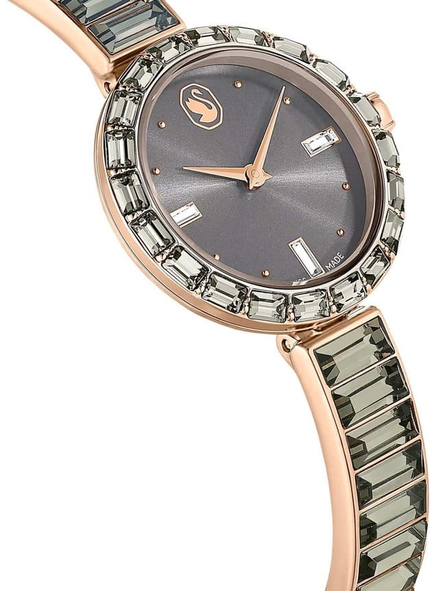 Часы Swarovski 5679887 – это гармоничное сочетание элегантности и функциональности, созданное для ценителей изысканных аксессуаров. Эти швейцарские кварцевые часы заключены в корпус из стали с розовым PVDPVDУльтратонкое покрытие наносится в технике вакуумного напыления, сочетает в себе нитрид титана особой прочности со слоем золота или оксида хрома. Несёт в себе декоративную или защитную функцию.-покрытием, который привлекает внимание своим утонченным стилем. Серый циферблат, выполненный по технологии Sunray, украшен логотипом Swarovski в виде лебедя на отметке 12 часов, добавляя часам особый шарм. БезельБезельВнешний ободок, закрепляющий стекло. В спортивных часах так называется поворотное кольцо с делениями на циферблате, выполняет роль таймера – замеряет отрезки времени на шкале. Неподвижный безель – элемент декора. Однонаправленно вращающийся безель на дайверских часах позволяет фиксировать моменты погружения и выныривания на поверхность., браслет и циферблат украшены мерцающими кристаллами Swarovski, создающими эффектный блеск и подчеркивающими роскошь изделия. Заводная головка дополнена кристаллом круглой огранки, придающим часам завершенность и изящество. Минеральное стеклоМинеральное стеклоМинеральное стекло представляет собой искусственно выращенный минерал кварца. Такое стекло отличается особой устойчивостью к повреждениям и царапинам. Уступает по некоторым качествам сапфировому стеклу. надежно защищает циферблат, а водозащита 50 WR позволяет не беспокоиться о контакте с водой в повседневных ситуациях. Стальной браслет с розовым PVDPVDУльтратонкое покрытие наносится в технике вакуумного напыления, сочетает в себе нитрид титана особой прочности со слоем золота или оксида хрома. Несёт в себе декоративную или защитную функцию.-покрытием, декорированный кристаллами, обеспечивает комфортное ношение и стильный внешний вид. С диаметром корпуса 25 мм и длиной браслета 16,5 см, эти часы станут изысканным дополнением к любому наряду. Часы Swarovski 5679887 – это не просто аксессуар, а настоящее произведение искусства, способное стать ярким акцентом вашего образа.