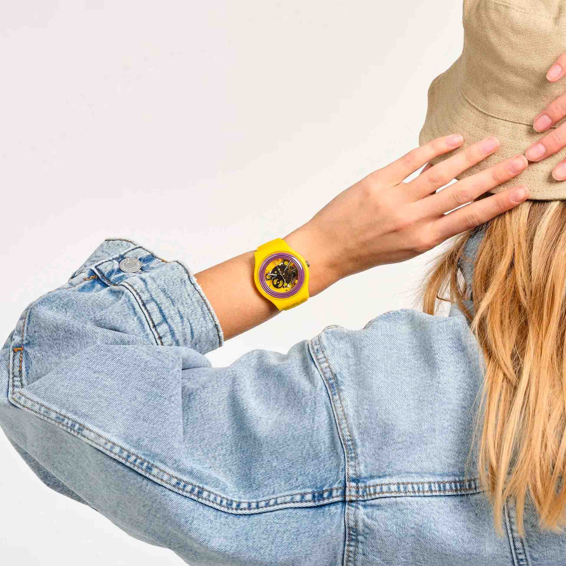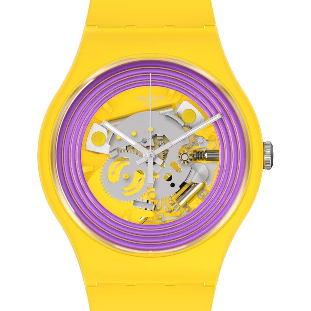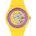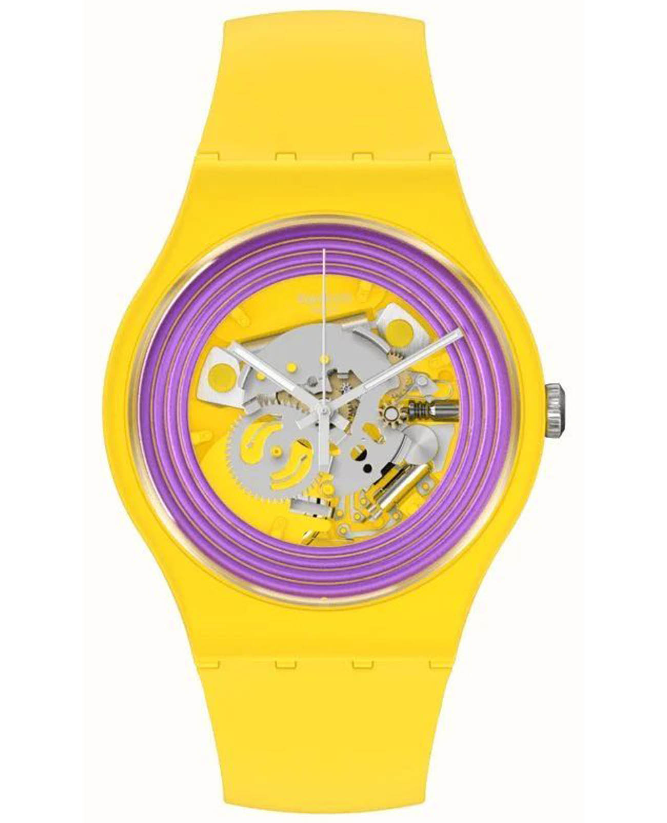Часы Swatch SO29J100 — эффектный и надежный аксессуар. Желтый силиконовый ремешок и корпус этих часов NEW GENT BIOSOURCED контрастируют с циферблатом, который имеет стекло из биоматериала, фиолетовое кольцо и стрелки с люминесцентным покрытиемЛюминесцентное покрытиеПозволяет считывать показания времени в темноте. Производители наносят на стрелки, часовые индексы, безель или поверхность циферблата светонакопительный состав, дающий холодное свечение.. Циферблат прозрачный, позволяет наблюдать механизм часов. Ремешок на стандартной застёжке. Внутри часов установлен надежный кварцевый механизм, который обеспечивает точность хода. Эти часы водонепроницаемы до 30 метров, что позволяет не беспокоиться о случайных брызгах или дождевых каплях. Swatch SO29J100 — это идеальный выбор для тех, кто ценит сочетание стиля, комфорта и функциональности в одном аксессуаре.