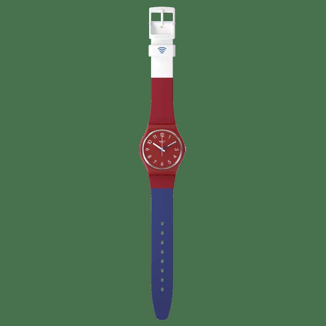 Часы Swatch Gent Biosourced Swatch Pay! SO28R109-5300  — это стильный и современный аксессуар, который идеально подходит для повседневного ношения. Они оснащены красным корпусом из биоматериала и силиконовым ремешком красно-сине-белого цвета. Эти часы поддерживают функцию SwatchPAY!. Циферблат покрыт органическим стеклом из хезалита, устойчивым к царапинам и ударам, что гарантирует долговечность изделия.  Внутри часов установлен надежный кварцевый механизм, который обеспечивает точность хода. Эти часы водонепроницаемы до 30 метров, что позволяет не беспокоиться о случайных брызгах или дождевых каплях. Ремешок часов  выполнен из силикона и имеет регулируемую длину, застежка классическая из алюминия. Swatch SO28R109-5300 — это идеальный выбор для тех, кто ценит сочетание стиля, комфорта и функциональности в одном аксессуаре.