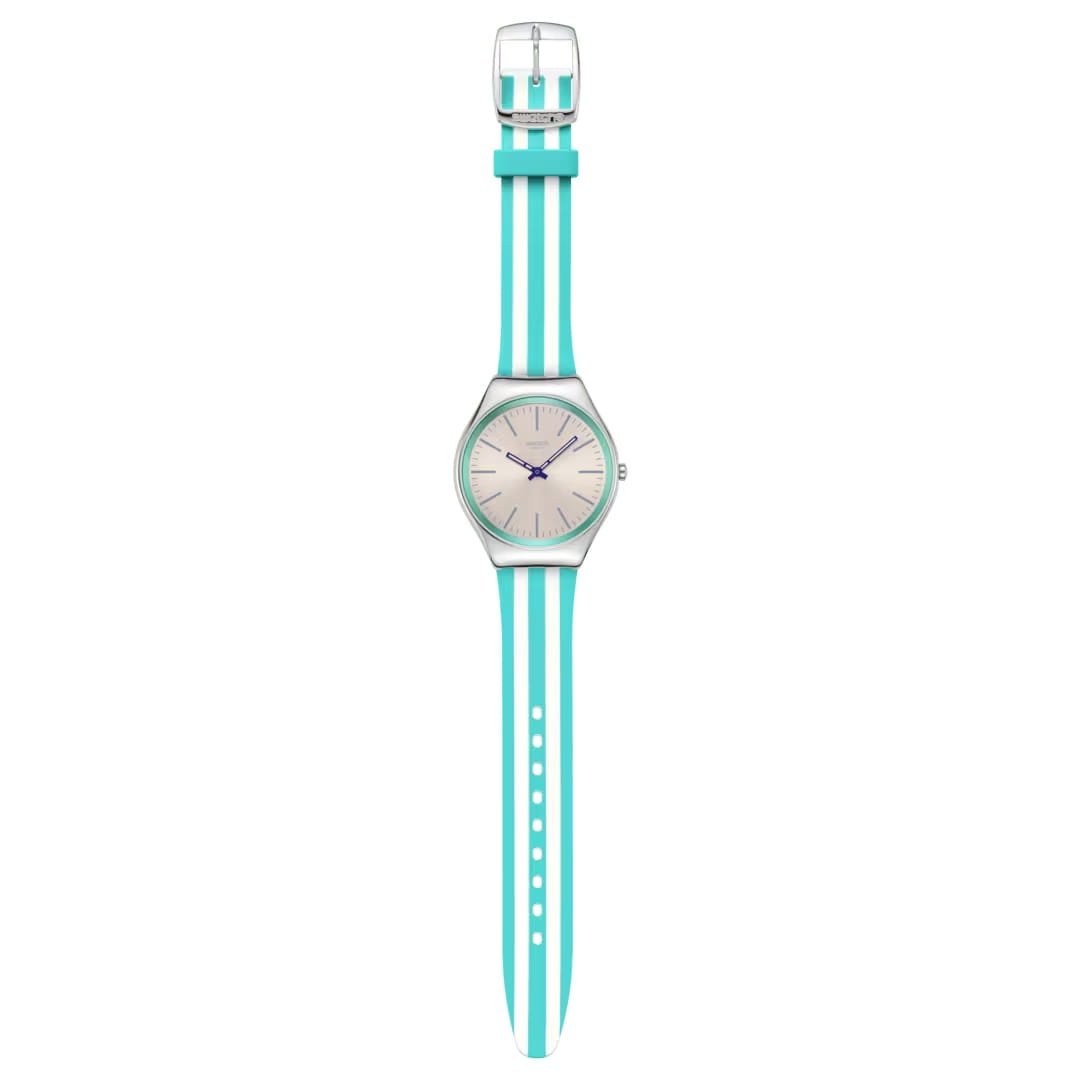 Женские наручные ультратонкие часы Swatch BEACH HOUR SYXS160 — это стильный и современный аксессуар для тех, кто ценит лёгкость и комфорт. Блестящий корпус и пряжка выполнены из нержавеющей стали серебристого цвета, диаметром 38 мм и толщиной 5.8 мм, что обеспечивает долговечность и утончённый внешний вид. Циферблат защищён органическим стеклом, устойчивым к повреждениям. Модель оснащена кварцевым механизмом, обеспечивающим высокую точность хода. Стрелки с люминесцентным покрытиемЛюминесцентное покрытиеПозволяет считывать показания времени в темноте. Производители наносят на стрелки, часовые индексы, безель или поверхность циферблата светонакопительный состав, дающий холодное свечение.. Матовым силиконовый ремешок на стандартной застёжке гармонично дополняет корпус и обеспечивает комфортное ношение. Водозащита 30 метров делает часы практичными для повседневного использования. Эти часы подойдут для повседневного ношения и станут ярким акцентом в вашем наряде.