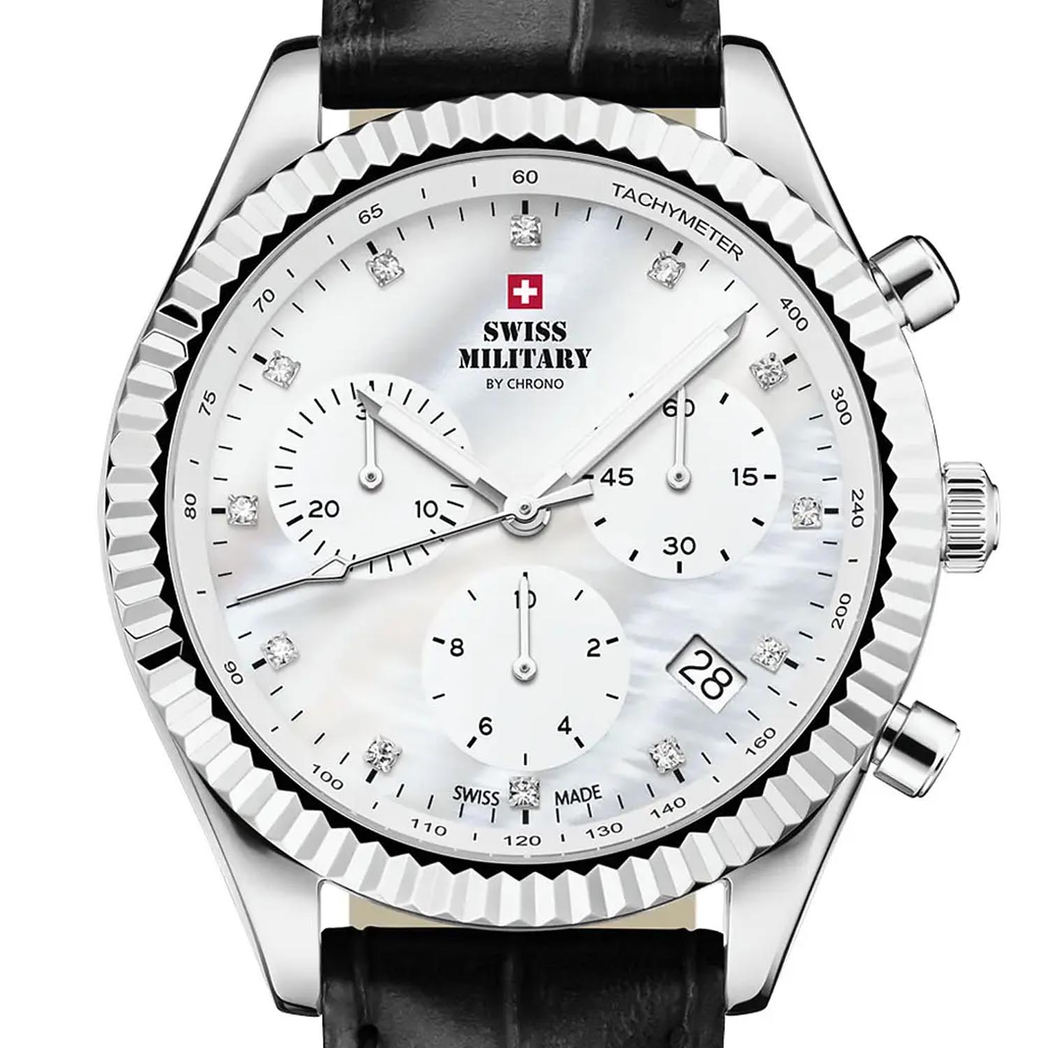 Женские швейцарские наручные часы-хронографХронографФункция позволяет измерять отрезки времени с особой точностью: часы, минуты, секунды. Верным признаком хронографа является наличие на циферблате 3 дополнительных окошек-счётчиков. Swiss Military by Chrono SM30207.06, кварцевый механизм с высокой точностью. Сапфировое стеклоСапфировое стеклоПрочный и надёжный материал из кристалла сапфира синтетического происхождения, характеризующийся особой твёрдостью и устойчивостью к царапинам и повреждениям. устойчивое к появлению царапин, обладающее высокой прозрачностью. Класс водозащиты: 50 метров, позволит защитить корпус от случайных брызг или капель дождя. Корпус часов изготовлен из стали. Ремешок с классической застежкой.