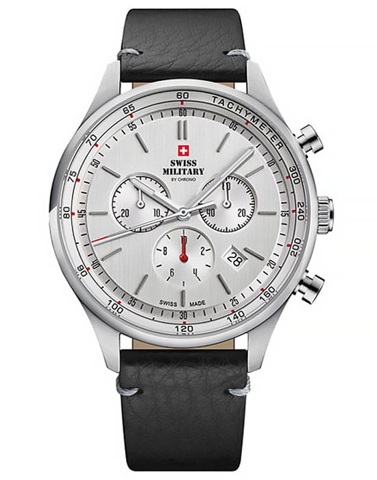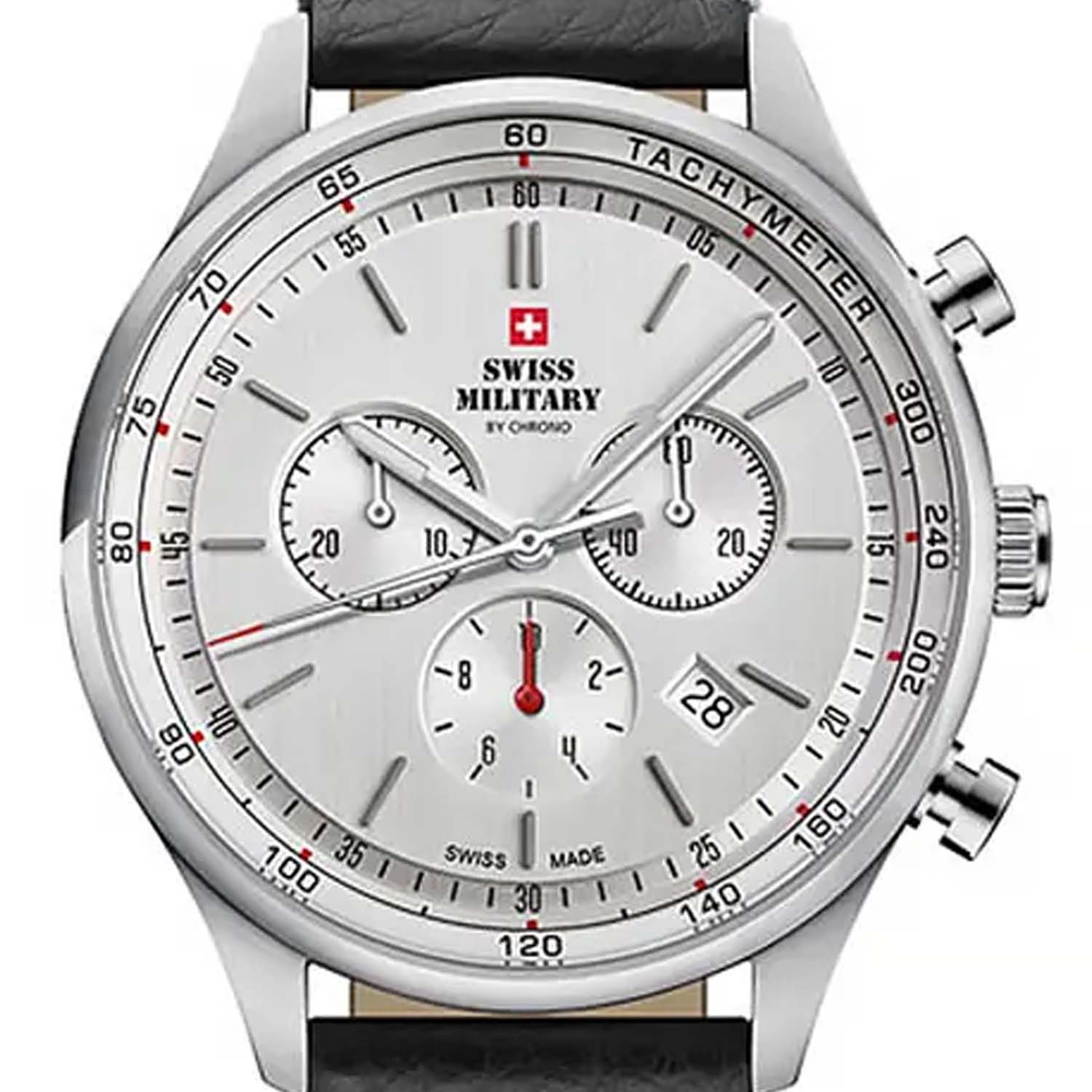 Мужские швейцарские наручные часы-хронографХронографФункция позволяет измерять отрезки времени с особой точностью: часы, минуты, секунды. Верным признаком хронографа является наличие на циферблате 3 дополнительных окошек-счётчиков. Swiss Military by Chrono SM34013.07, кварцевый механизм с высокой точностью. Класс водозащиты: 100 метров, позволит плавать, нырять и заниматься другими водными видами спорта. Стрелки с люминесцентным покрытиемЛюминесцентное покрытиеПозволяет считывать показания времени в темноте. Производители наносят на стрелки, часовые индексы, безель или поверхность циферблата светонакопительный состав, дающий холодное свечение.. Корпус часов изготовлен из стали. Минеральное стеклоМинеральное стеклоМинеральное стекло представляет собой искусственно выращенный минерал кварца. Такое стекло отличается особой устойчивостью к повреждениям и царапинам. Уступает по некоторым качествам сапфировому стеклу.. Ремешок с классической застежкой.