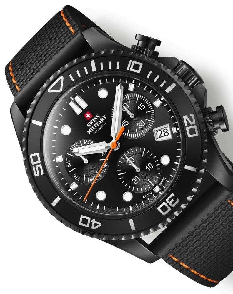 Часы Swiss Military SM34101.08 — это стильный мужской хронограф, который сочетает швейцарское качество и функциональность. Корпус диаметром 46 мм выполнен из нержавеющей стали с чёрным PVD-покрытиемPVDУльтратонкое покрытие наносится в технике вакуумного напыления, сочетает в себе нитрид титана особой прочности со слоем золота или оксида хрома. Несёт в себе декоративную или защитную функцию., что придаёт часам современный и прочный вид. Чёрный циферблат с люминесцентными стрелкамиЛюминесцентное покрытиеПозволяет считывать показания времени в темноте. Производители наносят на стрелки, часовые индексы, безель или поверхность циферблата светонакопительный состав, дающий холодное свечение. и метками обеспечивает превосходную читаемость даже в условиях низкой освещённости. Циферблат защищён сапфировым стекломСапфировое стеклоПрочный и надёжный материал из кристалла сапфира синтетического происхождения, характеризующийся особой твёрдостью и устойчивостью к царапинам и повреждениям., устойчивым к царапинам. Модель оснащена швейцарским кварцевым механизмом, обеспечивающим точное измерение времени. Хронограф позволяет отображать часы, минуты, секунды, а также дату, что добавляет удобства в повседневной жизни. Ремень из высококачественного каучука с оранжевой прострочкой и классической застёжкой обеспечивает комфортное ношение и надёжную фиксацию. Водозащита до 10 ATM делает часы подходящими для плавания и других водных активностей. Swiss Military — это идеальный выбор для мужчин, ценящих стиль, надёжность и функциональность.