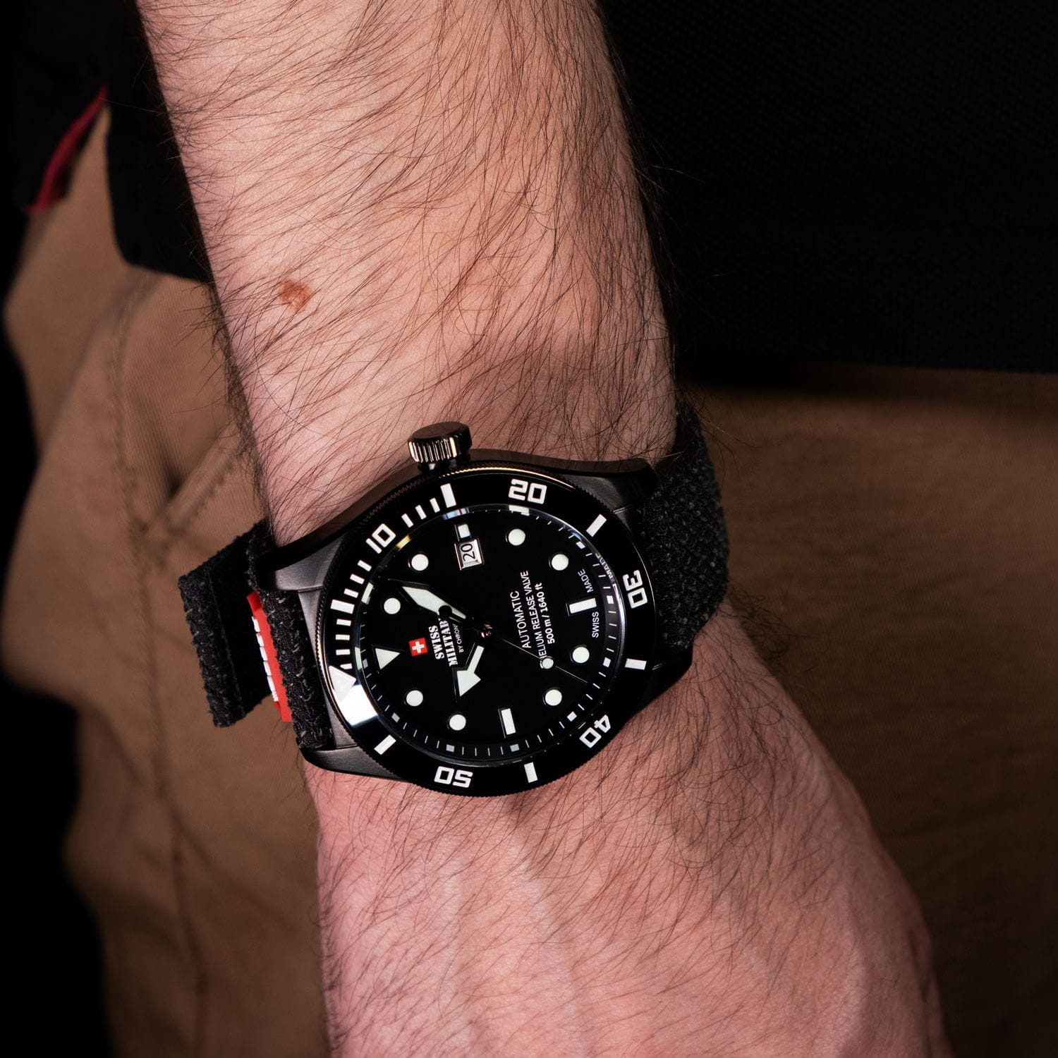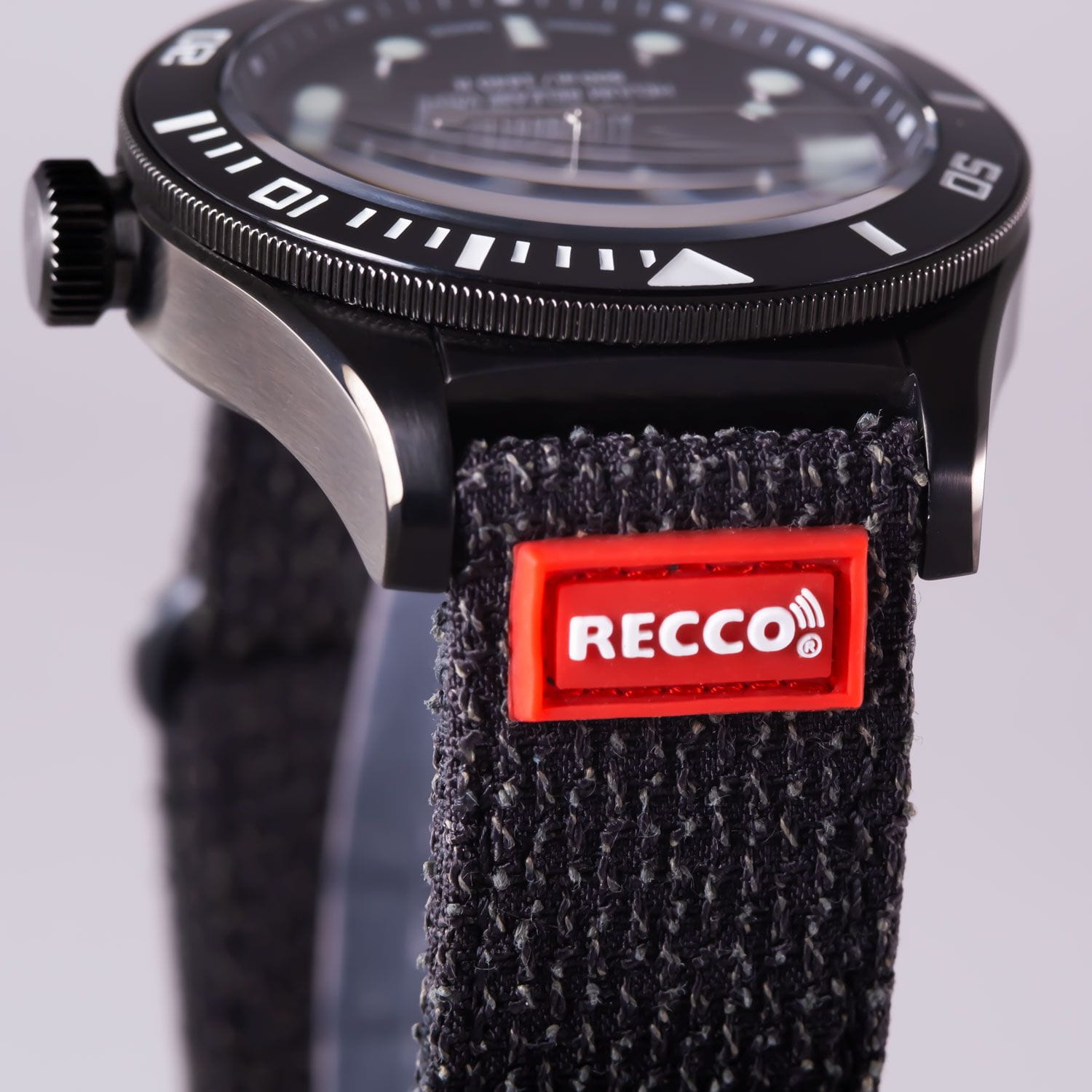 Be searchable – совместный проект с компанией Recco, благодаря которому были созданы уникальные специальные износостойкие ремешки для часов со встроенным отражателем Recco Advanced Rescue Technology. Поисковый отражатель Recco, встроенный в ремешок часов, позволяет профессиональным спасателям обнаружить потерявшегося человека при помощи детекторов Recco. Специальный детектор Recco SAR оперативно производит поиск с вертолета, охватывая территорию равную 1 км примерно за 6 минут. Отражателям Recco для функционирования не требуется питание или активация. Механические часы с автоподзаводом. Водостойкость WR 500. Центральные часовая, минутная и секундная стрелки. Индикация даты на позиции трех часов. Стрелки и метки с люминесцентным покрытием. Корпус выполнен из нержавеющей стали с PVD покрытием. Диаметр корпуса 44 мм. Устойчивое к возникновению царапин сапфировое стекло. Текстильный ремешок черного цвета. Механизм Ronda R-150.