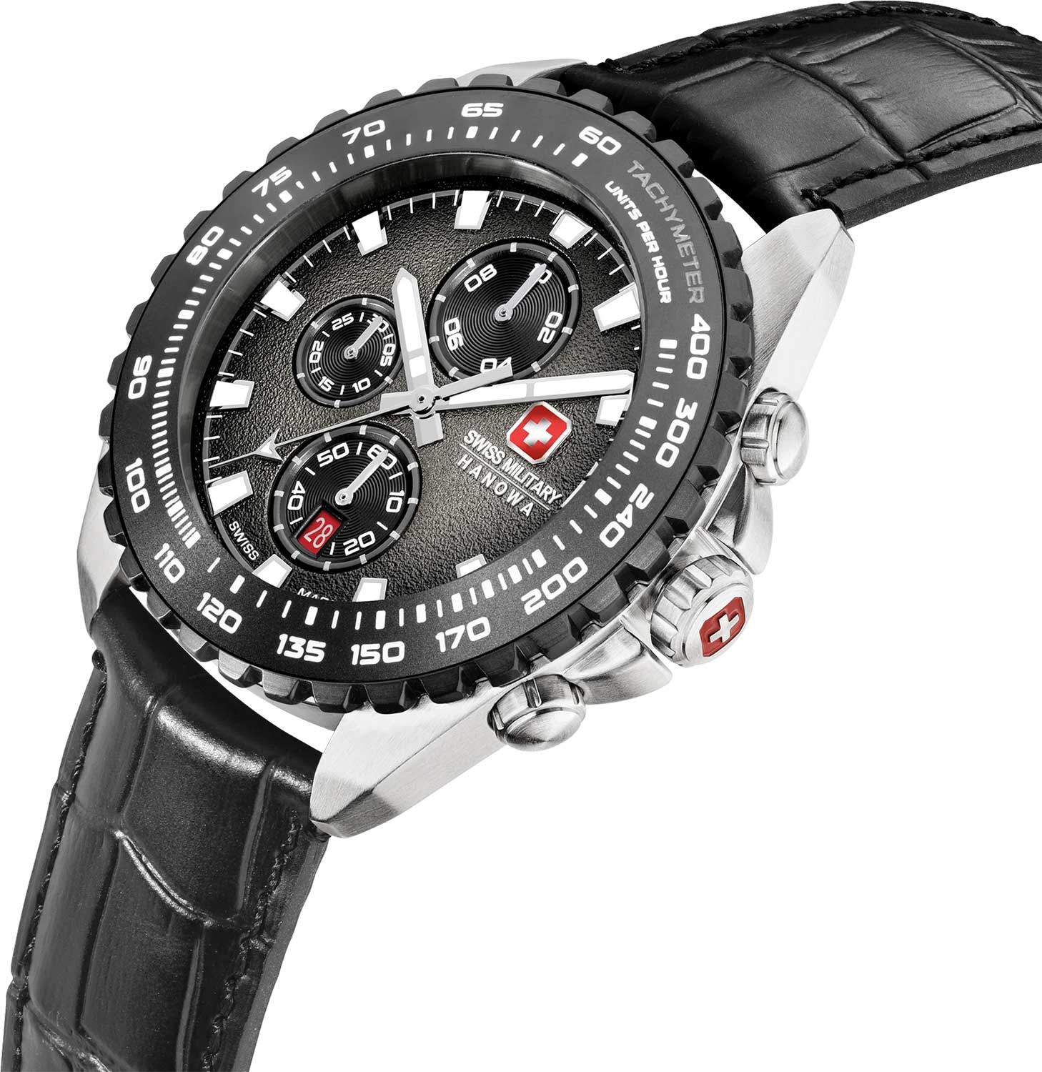 Мужские швейцарские часы- хронографХронографФункция позволяет измерять отрезки времени с особой точностью: часы, минуты, секунды. Верным признаком хронографа является наличие на циферблате 3 дополнительных окошек-счётчиков. с секундомеромСекундомерСекундоме́р — прибор, способный измерять интервалы времени с точностью до долей секунды. Swiss Military Hanowa Stone Marten SMWGC0001830, кварцевый механизм с высокой точностью. Сапфировое стеклоСапфировое стеклоПрочный и надёжный материал из кристалла сапфира синтетического происхождения, характеризующийся особой твёрдостью и устойчивостью к царапинам и повреждениям. устойчивое к появлению царапин, обладающее высокой прозрачностью. Корпус часов изготовлен из нержавеющей стали. Неподвижный безельБезельВнешний ободок, закрепляющий стекло. В спортивных часах так называется поворотное кольцо с делениями на циферблате, выполняет роль таймера – замеряет отрезки времени на шкале. Неподвижный безель – элемент декора. Однонаправленно вращающийся безель на дайверских часах позволяет фиксировать моменты погружения и выныривания на поверхность. из стали с IP-покрытиемIP-покрытиеМетод ионного напыления. Демонстрирует повышенную устойчивость к истиранию, окислению и химическим веществам. Под воздействием высокого давления и температуры около 1500°C молекулы металла надёжно соединяются с частицами корпуса часов. и шкалой тахиметрТахиметрРазмеченная шкала, располагается на ободке или безеле часов. Тахиметр позволяет рассчитать скорость на определённом участке пути, расстояние измеряется в километрах или милях.. Стрелки и метки с люминесцентным покрытиемЛюминесцентное покрытиеПозволяет считывать показания времени в темноте. Производители наносят на стрелки, часовые индексы, безель или поверхность циферблата светонакопительный состав, дающий холодное свечение.. Класс водозащиты: 100 метров, позволит плавать, нырять и заниматься другими водными видами спорта. Кожаный ремешок на стандартной застежке.