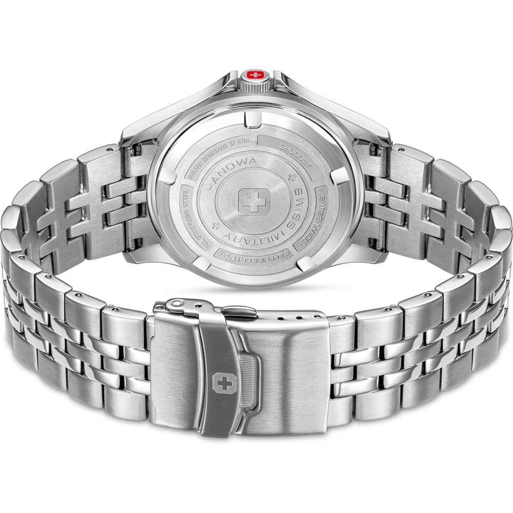 Мужские кварцевые часы Swiss Military Hanowa — швейцарская надёжность в классическом исполнении. Корпус круглый, из нержавеющей стали, диаметром 42 мм. Циферблат — зелёный с серебристыми стрелками. Стекло — сапфировоеСапфировое стеклоПрочный и надёжный материал из кристалла сапфира синтетического происхождения, характеризующийся особой твёрдостью и устойчивостью к царапинам и повреждениям.. Механизм — швейцарский кварцевый Ronda 505 с функцией (остановка секундной стрелки для точной настройки). БезельБезельВнешний ободок, закрепляющий стекло. В спортивных часах так называется поворотное кольцо с делениями на циферблате, выполняет роль таймера – замеряет отрезки времени на шкале. Неподвижный безель – элемент декора. Однонаправленно вращающийся безель на дайверских часах позволяет фиксировать моменты погружения и выныривания на поверхность. — неподвижный, из нержавеющей стали с IP-покрытиемIP-покрытиеМетод ионного напыления. Демонстрирует повышенную устойчивость к истиранию, окислению и химическим веществам. Под воздействием высокого давления и температуры около 1500°C молекулы металла надёжно соединяются с частицами корпуса часов.. Задняя крышка — завинчивающаяся. Водонепроницаемость 100 м. Браслет — стальной, на раскладной застёжке с кнопками и фиксаторомРаскладная застёжкаТакой тип застёжки используется только на браслетах из металла. Она никогда не раскрывается полностью, происходит разделение на 2 и более частей. Раскладывающая застёжка снизит вероятность потери часов к минимуму.. Идеальный выбор для тех, кто ценит швейцарское качество и классический стиль.