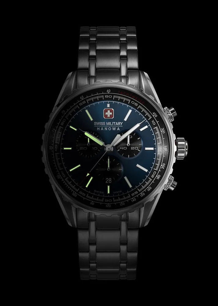 Мужские швейцарские часы Swiss Military Hanowa Afterburn Chrono SMWGI0000308 с хронографомХронографФункция позволяет измерять отрезки времени с особой точностью: часы, минуты, секунды. Верным признаком хронографа является наличие на циферблате 3 дополнительных окошек-счётчиков. и секундомеромСекундомерСекундоме́р — прибор, способный измерять интервалы времени с точностью до долей секунды.. Сапфировое стеклоСапфировое стеклоПрочный и надёжный материал из кристалла сапфира синтетического происхождения, характеризующийся особой твёрдостью и устойчивостью к царапинам и повреждениям. с антибликовым покрытием защищает циферблат от царапин и обеспечивает отличную читаемость при любом освещении. Корпус из нержавеющей стали диаметром 44 мм сбалансирован и элегантен. Браслет с раскладной застёжкойРаскладная застёжкаТакой тип застёжки используется только на браслетах из металла. Она никогда не раскрывается полностью, происходит разделение на 2 и более частей. Раскладывающая застёжка снизит вероятность потери часов к минимуму. идеально дополняют дизайн часов, обеспечивая комфортное ношение. Люминесцентное покрытиеЛюминесцентное покрытиеПозволяет считывать показания времени в темноте. Производители наносят на стрелки, часовые индексы, безель или поверхность циферблата светонакопительный состав, дающий холодное свечение. стрелок и меток позволит вам следить за временем даже в полной темноте. Стальной безельБезельВнешний ободок, закрепляющий стекло. В спортивных часах так называется поворотное кольцо с делениями на циферблате, выполняет роль таймера – замеряет отрезки времени на шкале. Неподвижный безель – элемент декора. Однонаправленно вращающийся безель на дайверских часах позволяет фиксировать моменты погружения и выныривания на поверхность. с PVD-покрытиемPVDУльтратонкое покрытие наносится в технике вакуумного напыления, сочетает в себе нитрид титана особой прочности со слоем золота или оксида хрома. Несёт в себе декоративную или защитную функцию.. Часы оснащены центральной секундной стрелкой и окошком даты в положении «6 часов», что делает их функциональными для повседневного использования. ТахиметрТахиметрРазмеченная шкала, располагается на ободке или безеле часов. Тахиметр позволяет рассчитать скорость на определённом участке пути, расстояние измеряется в километрах или милях. по внешнему краю. Водонепроницаемость до 100 метров. Идеальный выбор для тех, кто ценит качество и долговечность.