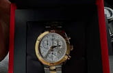Модель привлекает оригинальным внешним видом, дизайнеры умело сочетают серебристый и золотистый оттенок. Классический стиль со спортивными деталями позволяет использовать часы в качестве дополнения к любому образу. Минималистичный циферблат. Кварцевый калибр ETA G15.212 с высокой точностью хода. Водонепроницаемость до 10 бар. Функционал: хронограф, секундомер, календарь. Габариты: 38 x 38 x 10,5 мм.