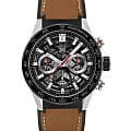 Черный, ультрасовременный хронограф TAG Heuer Carrera с мануфактурным механизмом Heuer 02, запасом хода 80 часов и коричневым ремешком из телячьей кожи. Внешний вид модели придется по вкусу автолюбителям, ценящим скорость. TAG Heuer Carrera CBG2010.FT6144, механический механизм (автоматический калибр) с высокой точностью. Сапфировое стекло устойчивое к появлению царапин, обладающее высокой прозрачностью. Класс водозащиты: 100 метров, позволит плавать, нырять и заниматься другими водными видами спорта. Корпус часов изготовлен из стали, цвета.