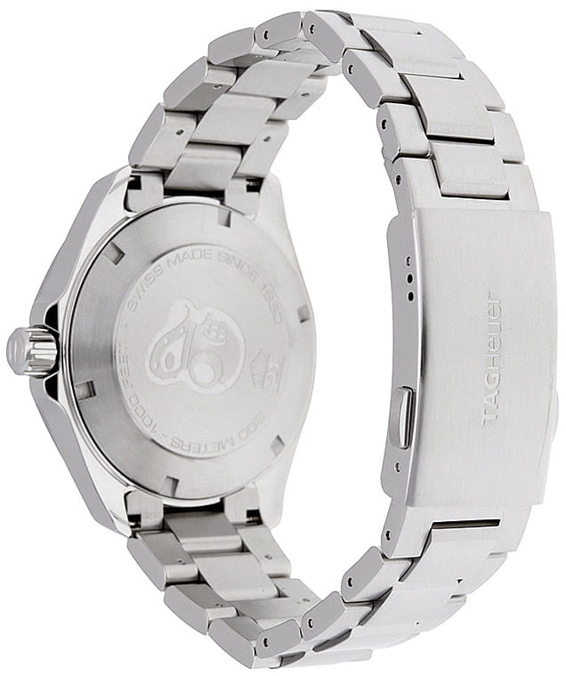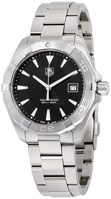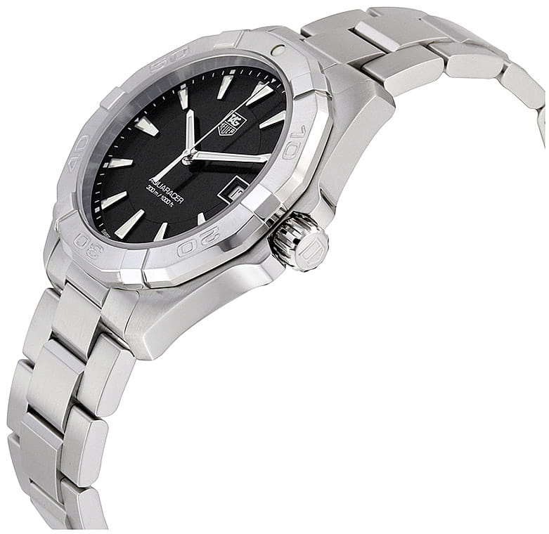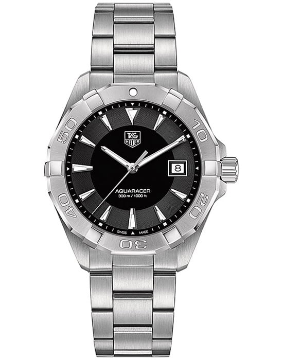 TAG Heuer Aquaracer WAY1110.BA0928 — элегантные мужские часы, сочетающие в себе стиль и функциональность. Корпус диаметром 41 мм выполнен из нержавеющей стали, а безельБезельВнешний ободок, закрепляющий стекло. В спортивных часах так называется поворотное кольцо с делениями на циферблате, выполняет роль таймера – замеряет отрезки времени на шкале. Неподвижный безель – элемент декора. Однонаправленно вращающийся безель на дайверских часах позволяет фиксировать моменты погружения и выныривания на поверхность. также изготовлен из стали, что придаёт модели дополнительную прочность и долговечность. Чёрный циферблат с солнечным узором оснащён накладными часовыми метками и стрелками с люминесцентным покрытиемЛюминесцентное покрытиеПозволяет считывать показания времени в темноте. Производители наносят на стрелки, часовые индексы, безель или поверхность циферблата светонакопительный состав, дающий холодное свечение., обеспечивающим отличную читаемость в любых условиях освещения. Часы оснащены точным кварцевым механизмом, гарантирующим надёжное отображение времени. Функциональность включает индикацию часов, минут, секунд и даты. Сапфировое стеклоСапфировое стеклоПрочный и надёжный материал из кристалла сапфира синтетического происхождения, характеризующийся особой твёрдостью и устойчивостью к царапинам и повреждениям. с антибликовым покрытиемАнтибликовое покрытиеСлой оксида металла в 0,13-0,3 микрон, благодаря которому стекло часов не бликует и не отражает свет. Антибликовое покрытие уменьшает отражение света в 10 раз, обеспечивая отличную читаемость показателей циферблата. обеспечивает защиту от царапин и превосходную читаемость. Браслет из нержавеющей стали оснащён раскладной застёжкойРаскладная застёжкаТакой тип застёжки используется только на браслетах из металла. Она никогда не раскрывается полностью, происходит разделение на 2 и более частей. Раскладывающая застёжка снизит вероятность потери часов к минимуму. с кнопками для дополнительной безопасности. Водозащита до 300 метров (30 бар) делает модель подходящей для дайвинга и других водных видов спорта.