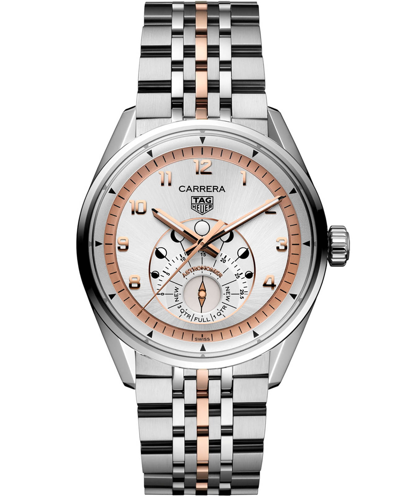 Часы TAG Heuer Carrera Astronomer WBX2111.BD0002 созданы для стильных мужчин. Механический механизм (автоматический калибр) с высокой точностью и с 50-часовым запасом хода. Сапфировое стеклоСапфировое стеклоПрочный и надёжный материал из кристалла сапфира синтетического происхождения, характеризующийся особой твёрдостью и устойчивостью к царапинам и повреждениям. устойчивое к появлению царапин, обладающее высокой прозрачностью. Класс водозащиты: 100 метров, позволит плавать, нырять и заниматься другими водными видами спорта. Стрелки с люминесцентным покрытиемЛюминесцентное покрытиеПозволяет считывать показания времени в темноте. Производители наносят на стрелки, часовые индексы, безель или поверхность циферблата светонакопительный состав, дающий холодное свечение. позволяют легко считывать время даже в условиях недостаточного освещения. Завинчивающаяся задняя крышка украшена специальной гравировкой с изображением обсерватории и звёздного неба. По центру, у отметки «6 часов», расположен серебристый диск указателя фаз Луны, обрамлённый оригинальной шкалой, которая позволяет визуально следить за ходом лунного цикла. Часы оснащены браслетом из нержавеющей стали с 18-ти каратным золотом 5N и с застёжкой-бабочка с кнопкамиЗастёжка "бабочка"Такой вид застёжки дополняется предохранителями, помогающими избежать случайного раскрытия браслета. Обладают изящным исполнением. , которые гарантируют комфортную посадку на запястье. Модель выпущена ограниченной серией 500 экземпляров. TAG Heuer Carrera олицетворяет непринужденную элегантность и представляет свежий взгляд на настоящую классику.