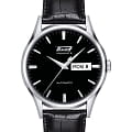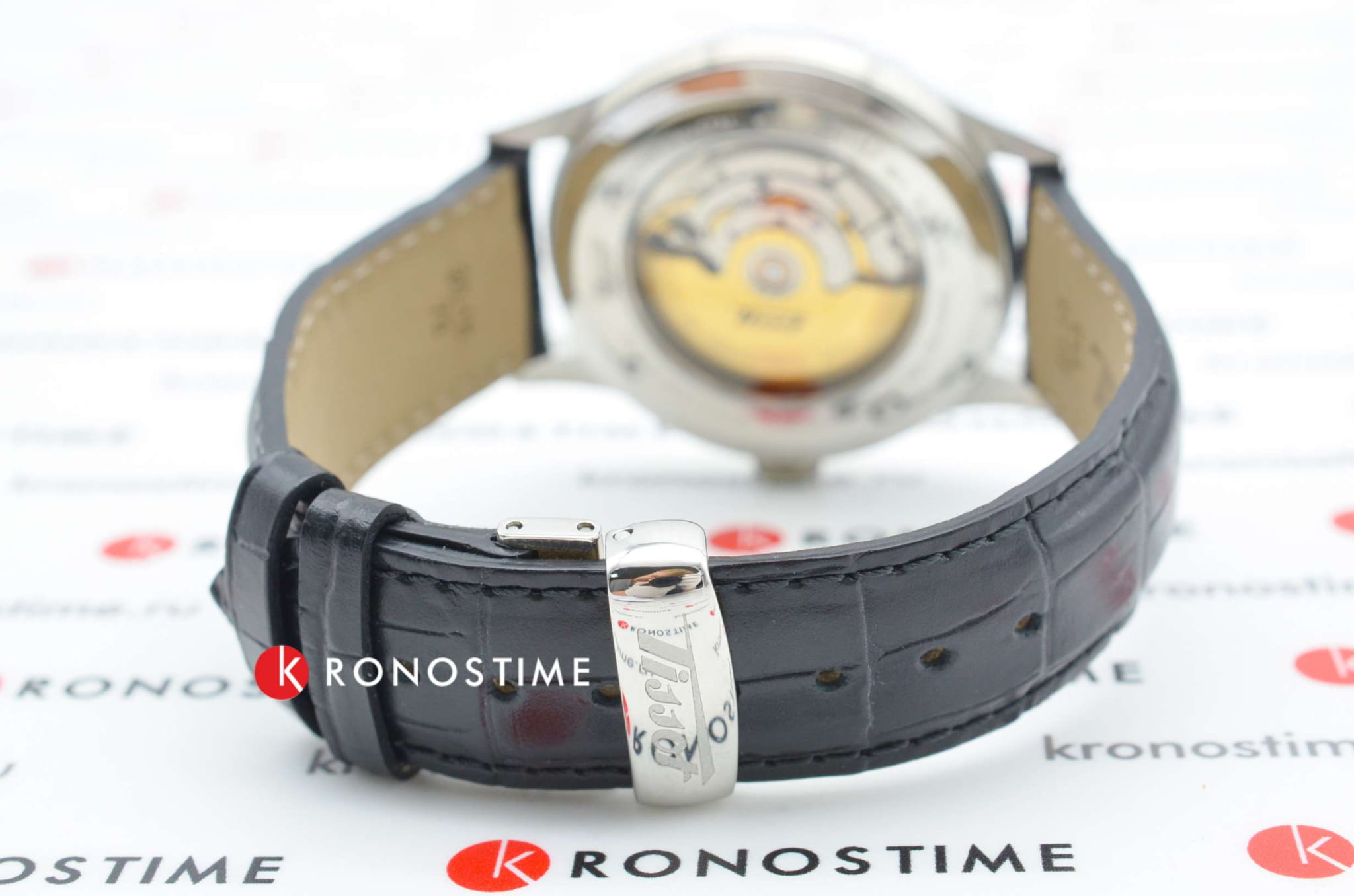 Аксессуар в лаконичном исполнении выполнен в строгом чёрном цвете, сдержанный оттенок идеально сочетается с металлическим блеском корпуса из нержавеющей стали. Часы оснащены автоматическим калибром ETA 2836-2, движение деталей прослеживается через прозрачную заднюю крышку. Ремешок с тиснением под кожу крокодила. Функция календаря. Габариты: 40 x 40 x 11,6 мм.
