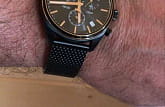 Прочный стальной корпус устойчив к появлению царапин и повреждений, часы сохранят первоначальный внешний вид на много лет благодаря золотому PVD-покрытиюPVDУльтратонкое покрытие наносится в технике вакуумного напыления, сочетает в себе нитрид титана особой прочности со слоем золота или оксида хрома. Несёт в себе декоративную или защитную функцию.. Браслет миланского плетения дополнен ювелирной застежкой с фиксатором. Сапфировое стекло. Водонепроницаемость до 10 бар. Функции: хронографХронографФункция позволяет измерять отрезки времени с особой точностью: часы, минуты, секунды. Верным признаком хронографа является наличие на циферблате 3 дополнительных окошек-счётчиков., секундомер, календарь. Габариты: 41 x 41 x 10,7 мм.