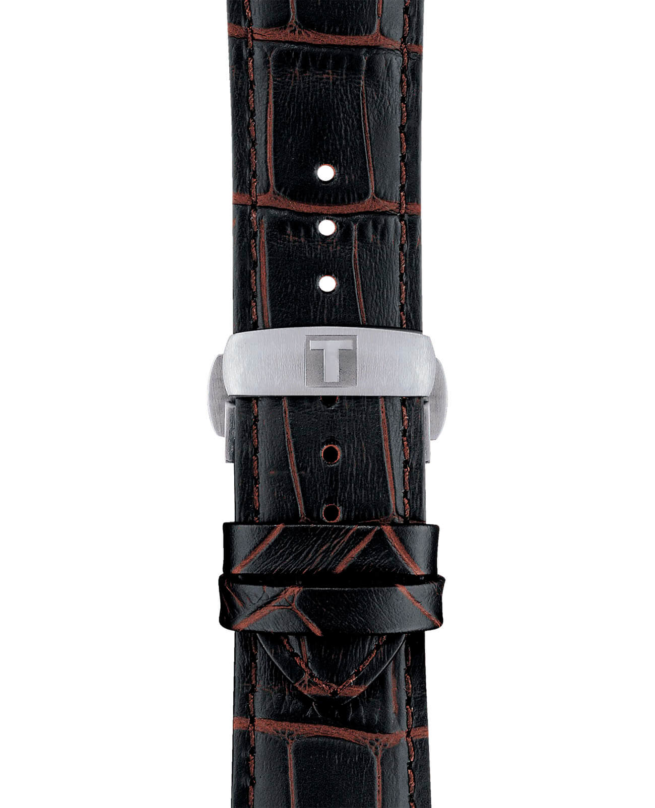 Дизайнеры выбрали для модели суженный безельБезельВнешний ободок, закрепляющий стекло. В спортивных часах так называется поворотное кольцо с делениями на циферблате, выполняет роль таймера – замеряет отрезки времени на шкале. Неподвижный безель – элемент декора. Однонаправленно вращающийся безель на дайверских часах позволяет фиксировать моменты погружения и выныривания на поверхность., такая особенность зрительно увеличивает циферблат и ускоряет процесс считывания показателей. Массивный стальной корпус сочетается с ремешком из натуральной коровьей кожи, поверхность имитирует рисунок кожи крокодила. Метки и стрелки имеют люминесцентное покрытиеЛюминесцентное покрытиеПозволяет считывать показания времени в темноте. Производители наносят на стрелки, часовые индексы, безель или поверхность циферблата светонакопительный состав, дающий холодное свечение., что позволяет использовать часы в темноте. Швейцарский калибр ETA C01.211 с запасом хода 45 часов. Сапфировое стекло устойчиво к возникновению царапин. Водонепроницаемость до 20 бар. . Секундомер, апертура даты. Габариты: 43 x 44 x 16,3 мм.