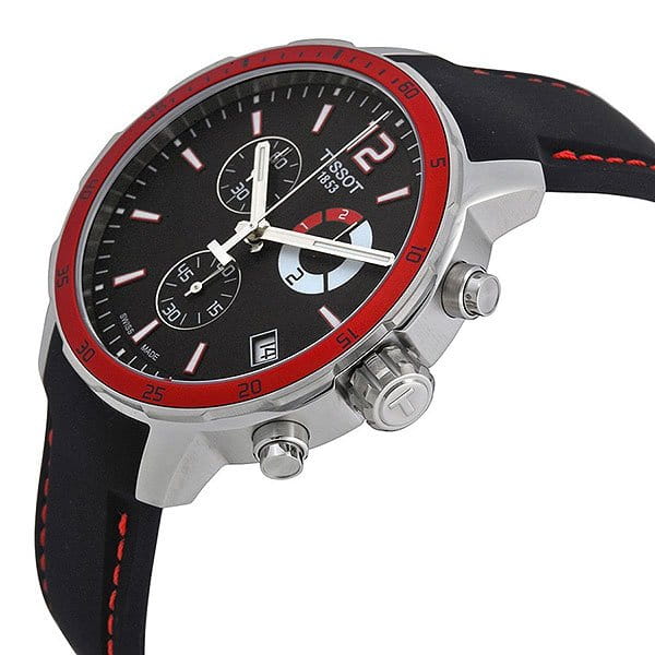 Часы оснащены швейцарским кварцевым механизмом ETA G10.211, обеспечивающим точный ход и функции хронографа с точностью до 1/10 секунды. Циферблат защищён сапфировым стекломСапфировое стеклоПрочный и надёжный материал из кристалла сапфира синтетического происхождения, характеризующийся особой твёрдостью и устойчивостью к царапинам и повреждениям., устойчивым к царапинам. Фиксированный алюминиевый безель с красной вставкой подчёркивает динамичный характер модели.