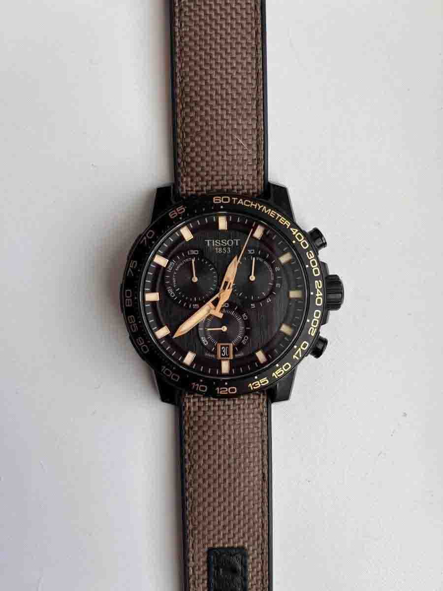 Мужские швейцарские часы Tissot SuperSport Chrono T125.617.37.051.01 с кварцевым механизмом — квинтэссенция современного спортивного стиля. Метки обеспечивают лучшую читаемость показаний и придают циферблату глубину. Tissot Supersport Chrono — мужская, динамичная и футуристическая коллекция, широкий выбор моделей которой позволит каждому выбрать часы, которые лучше всего подходят для его запястья. Аксессуар позволит грамотно дополнить образ, гармония чёрно-золотистой палитры никогда не потеряет актуальности. Наручные часы позволят всегда находиться в центре внимания. Массивный циферблат с крупной индикацией времени, симметричным расположением окошек – важная деталь для делового мужчины, привыкшего всё делать вовремя. Кожаный ремешок бежевого цвета. Швейцарский кварцевый механизм ETA G10.212. Сапфировое стекло. Корпус из нержавеющей стали с PVD-покрытиемPVDУльтратонкое покрытие наносится в технике вакуумного напыления, сочетает в себе нитрид титана особой прочности со слоем золота или оксида хрома. Несёт в себе декоративную или защитную функцию.. БезельБезельВнешний ободок, закрепляющий стекло. В спортивных часах так называется поворотное кольцо с делениями на циферблате, выполняет роль таймера – замеряет отрезки времени на шкале. Неподвижный безель – элемент декора. Однонаправленно вращающийся безель на дайверских часах позволяет фиксировать моменты погружения и выныривания на поверхность. размечен шкалой тахиметраТахиметрРазмеченная шкала, располагается на ободке или безеле часов. Тахиметр позволяет рассчитать скорость на определённом участке пути, расстояние измеряется в километрах или милях.. Водонепроницаемость до 10 бар. Люминесцентная подсветкаЛюминесцентное покрытиеПозволяет считывать показания времени в темноте. Производители наносят на стрелки, часовые индексы, безель или поверхность циферблата светонакопительный состав, дающий холодное свечение.. Секундомер, хронографХронографФункция позволяет измерять отрезки времени с особой точностью: часы, минуты, секунды. Верным признаком хронографа является наличие на циферблате 3 дополнительных окошек-счётчиков., индикация числа. Длина и ширина корпуса: 45,5 мм. Производство и сборка: Швейцария.