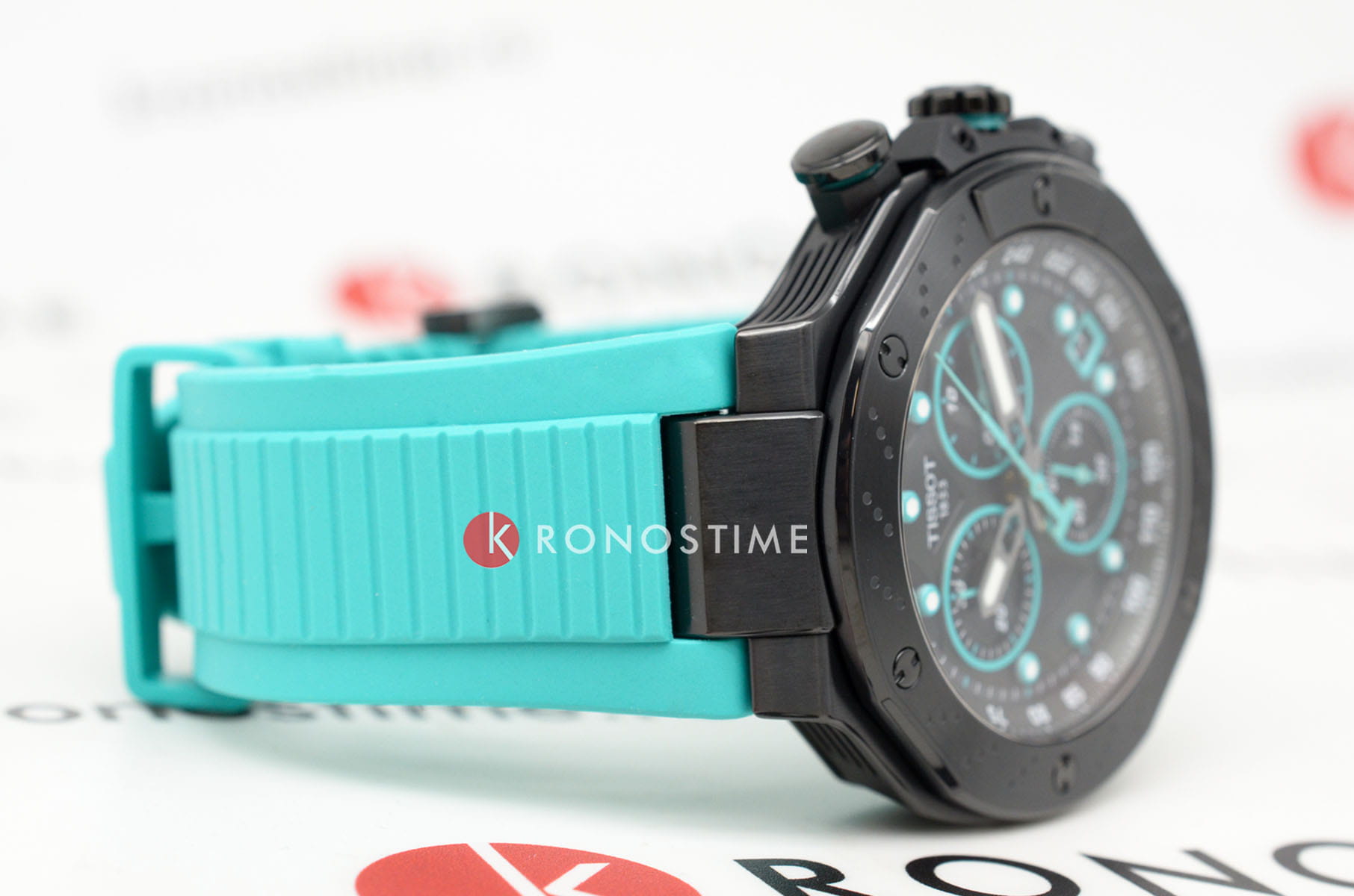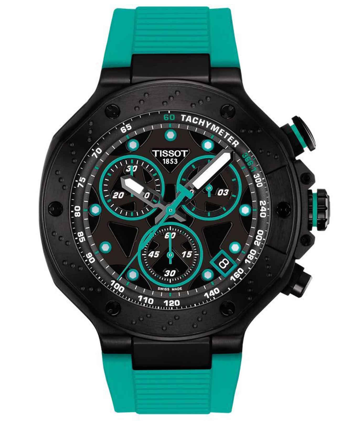 Tissot T-Race MotoGP Quartz Chronograph T141.417.37.051.01 – серия мужских часов, посвященная сотрудничеству Tissot с чемпионатом MotoGP™. Корпус диаметром 45 мм выполнен из нержавеющей стали 316L и корпус с PVD-покрытиемPVDУльтратонкое покрытие наносится в технике вакуумного напыления, сочетает в себе нитрид титана особой прочности со слоем золота или оксида хрома. Несёт в себе декоративную или защитную функцию. в чёрном цвете, придающим часам современный и спортивный вид. Глубокий циферблат защищён сапфировым стекломСапфировое стеклоПрочный и надёжный материал из кристалла сапфира синтетического происхождения, характеризующийся особой твёрдостью и устойчивостью к царапинам и повреждениям. с антибликовым покрытиемАнтибликовое покрытиеСлой оксида металла в 0,13-0,3 микрон, благодаря которому стекло часов не бликует и не отражает свет. Антибликовое покрытие уменьшает отражение света в 10 раз, обеспечивая отличную читаемость показателей циферблата., обеспечивающим устойчивость к царапинам и отличную читаемость в любых условиях. Задняя крышка корпуса украшена гравировкой, подчеркивающей уникальность модели. Часы оснащены швейцарским кварцевым механизмом, обеспечивающим высокую точность хода. Функциональность модели включает хронографХронографФункция позволяет измерять отрезки времени с особой точностью: часы, минуты, секунды. Верным признаком хронографа является наличие на циферблате 3 дополнительных окошек-счётчиков. с центральной секундной стрелкой, 30-минутным и 1/10-секундным счетчиками, а также функциями ADD и сплит-хронографаСплит-хронографИспользуется для измерения продолжительности нескольких временных отрезков, начинающихся одновременно, а заканчивающихся в разное время.. Индексы и стрелки покрыты люминесцентным покрытиемЛюминесцентное покрытиеПозволяет считывать показания времени в темноте. Производители наносят на стрелки, часовые индексы, безель или поверхность циферблата светонакопительный состав, дающий холодное свечение. Super-LumiNova®, обеспечивающим отличную видимость в темное время суток. Бирюзовый силиконовый ремешок с классической застёжкой обеспечивает комфортное ношение и надёжную фиксацию на запястье. Водозащита до 100 метров (10 бар) позволяет использовать часы во время плавания и других водных видов спорта. Эта модель идеально подходит для поклонников MotoGP™ и ценителей высококачественных швейцарских часов с уникальным дизайном и расширенной функциональностью.