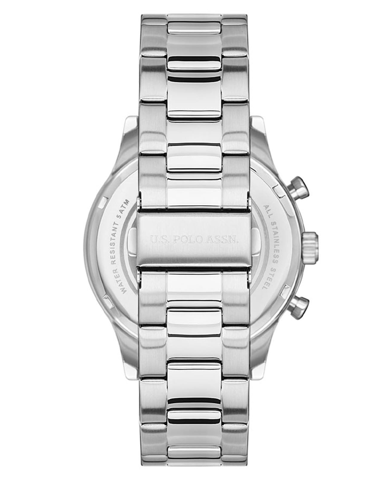 Мужские часы часы-хронографХронографФункция позволяет измерять отрезки времени с особой точностью: часы, минуты, секунды. Верным признаком хронографа является наличие на циферблате 3 дополнительных окошек-счётчиков. U.S. Polo Assn. Crossing USPA1010-10, кварцевый механизм с высокой точностью. Минеральное стеклоМинеральное стеклоМинеральное стекло представляет собой искусственно выращенный минерал кварца. Такое стекло отличается особой устойчивостью к повреждениям и царапинам. Уступает по некоторым качествам сапфировому стеклу. устойчивое к появлению царапин, обладающее высокой прозрачностью. Центральные часовая, минутная и секундная стрелки. Индикация даты и дня недели. 12/24х часовой формат времени. Корпус и браслет изготовлены из нержавеющей стали. На циферблате три дополнительных индикатора. Стрелки и метки с люминесцентным покрытиемЛюминесцентное покрытиеПозволяет считывать показания времени в темноте. Производители наносят на стрелки, часовые индексы, безель или поверхность циферблата светонакопительный состав, дающий холодное свечение.. Класс водозащиты: 50 метров, позволит защитить корпус от случайных брызг или капель дождя. Стальной браслет на застёжке «бабочка» с кнопкамиЗастёжка "бабочка"Такой вид застёжки дополняется предохранителями, помогающими избежать случайного раскрытия браслета. Обладают изящным исполнением. .