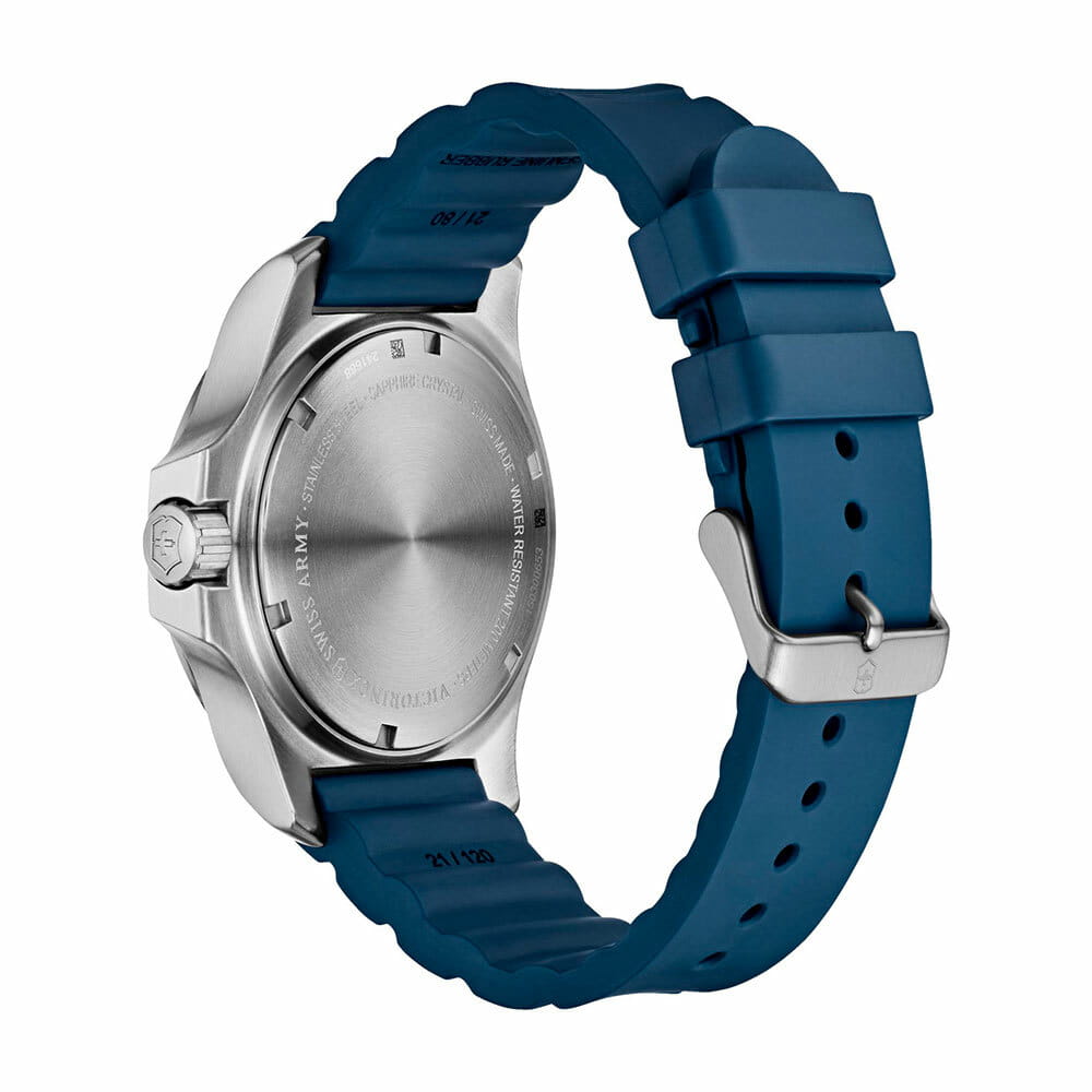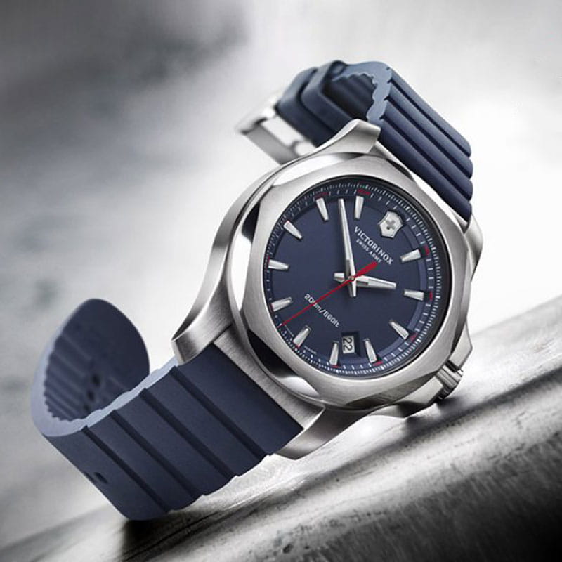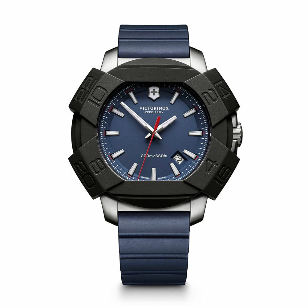 Мужские швейцарские часы Victorinox I.N.O.X. 241688.1. Сапфировое стеклоСапфировое стеклоПрочный и надёжный материал из кристалла сапфира синтетического происхождения, характеризующийся особой твёрдостью и устойчивостью к царапинам и повреждениям. с трёхслойным антибликовым покрытием. Корпус часов выполнен из нержавеющей стали 316L. Влагозащита: 200 метров, позволит плавать, нырять и заниматься другими водными видами спорта. Окошко даты находится в положении между 4 и 5 часов. Стрелки и метки с люминесцентным покрытиемЛюминесцентное покрытиеПозволяет считывать показания времени в темноте. Производители наносят на стрелки, часовые индексы, безель или поверхность циферблата светонакопительный состав, дающий холодное свечение.. Функция индикации заряда EOLEOLПредставляет собой систему, уведомляющую владельца часов о необходимости замены элемента питания. За 2 недели до полного разряда батарейки секундная стрелка перестаёт ходить чётко и начинает перепрыгивать на 3-4 деления.. Съемный защитный бампер.