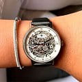 Женские наручные часы Zeppelin Princess of the Sky 7461-1 представляют собой изысканный скелетонизированный дизайн, где механизм украшен сверкающими кристаллами Swarovski. Модель обладает круглым корпусом диаметром 36 мм, изготовленным из нержавеющей стали, что обеспечивает высокую устойчивость к внешним воздействиям. Браслет выполнен из качественной текстурированной кожи, контрастирующей с металлическими элементами. Для защиты механизма используется минеральное стеклоМинеральное стеклоМинеральное стекло представляет собой искусственно выращенный минерал кварца. Такое стекло отличается особой устойчивостью к повреждениям и царапинам. Уступает по некоторым качествам сапфировому стеклу. с антибликовое покрытиеАнтибликовое покрытиеСлой оксида металла в 0,13-0,3 микрон, благодаря которому стекло часов не бликует и не отражает свет. Антибликовое покрытие уменьшает отражение света в 10 раз, обеспечивая отличную читаемость показателей циферблата., обеспечивающее прочную защиту от царапин и оптимальную видимость циферблата. Часы работают на автоматическом механизме, заряжаемом за счет естественного движения руки пользователя, что делает их автономными в использовании. Водонепроницаемость часов составляет 5 атмосфер (50 метров), что позволяет использовать их в повседневных условиях, однако не рекомендуется для плавания или дайвинга. Эта модель отличается своей элегантностью и станет прекрасным дополнением как к повседневному, так и к вечернему образу.